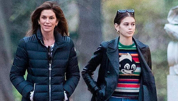 Образ звезда дополнила удлиненным кожаным плащом Frame.Гербер давно призналась, что звездная мама оказала большое влияние на ее стиль. В этот день Синди Кроуфорд была замечена в похожем образе: синие джинсы, черные полусапоги, полосатый топ и черная удлиненная куртка.