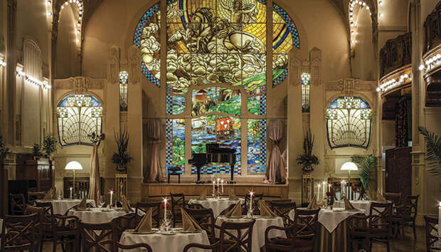 Ресторан высокой кухни расположен в самом сердце Петербурга, рядом с оживленным Невским проспектом, в подлинных интерьерах ар-нуво первой в стране пятизвездочной гостиницы — Гранд Отеля Европа. В зал ресторана свет льется сквозь крышу из цветной мозаики работы Карла Бренцена (1908) и отражается на благородных стеклах витража «Аполлон на колеснице» по эскизу Леонтия Бенуа (1905). С балконов ресторана можно любоваться нарядной публикой, которая отдает должное гастрономическим изыскам или танцует под звуки живого оркестра. Для тех, кто предпочитает досуг поспокойнее, предназначены пять уютных кабинетов, смежных с главным залом. Здесь все уникально, и это место – для уникальных событий!