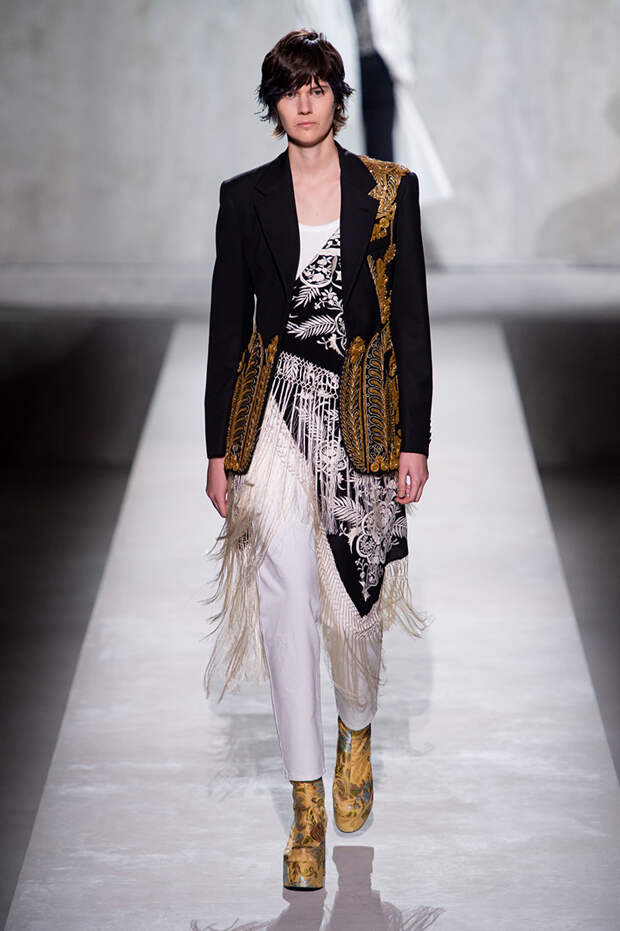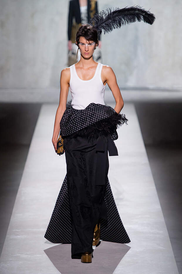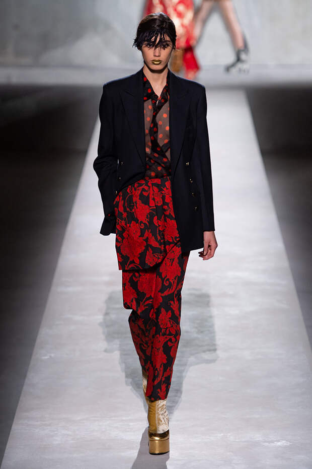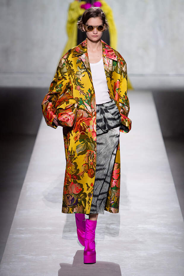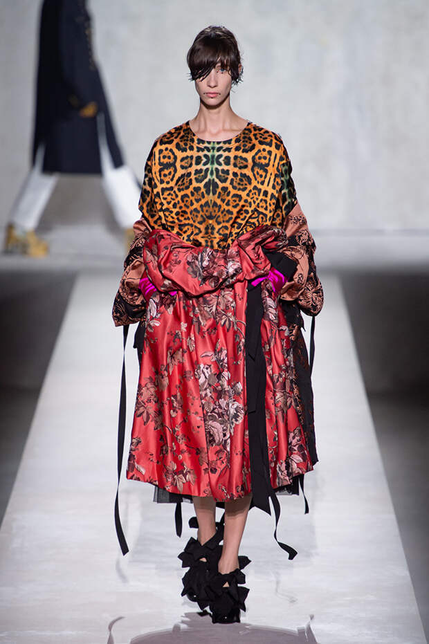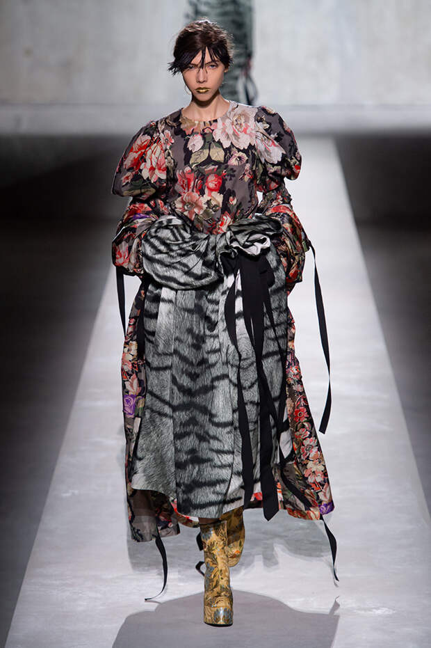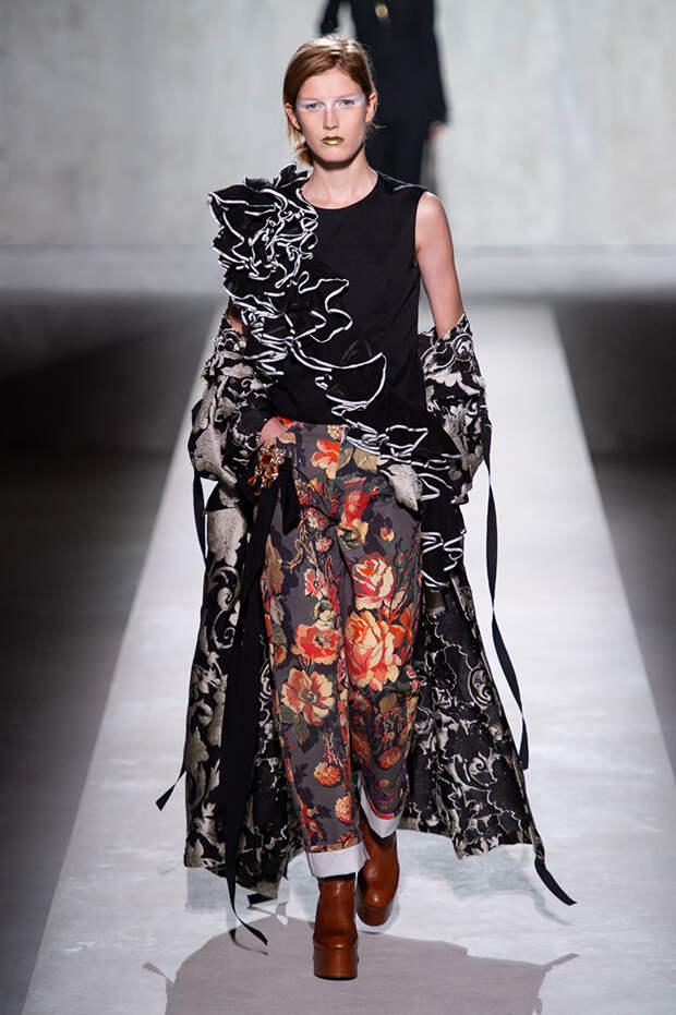 Дриса Ван Нотена мы в принципе любим за далеко не минималистичный подход к моде, но на этот раз он превзошел сам себя. Работал над коллекцией бельгийский дизайнер на этот раз не один, а в дуэте с Кристианом Лакруа — французским кутюрье, сделавшим себе имя в 80-х, а в 2009 году отошедший от дел собственного модного дома. Почему Ван Нотен пригласил к сотрудничеству именно Лакруа, о котором в последнее время не было слышно практически ничего? Потому что тот — настоящее воплощение яркой, вызывающе броской, максималистской моды 80-х и 90-х.