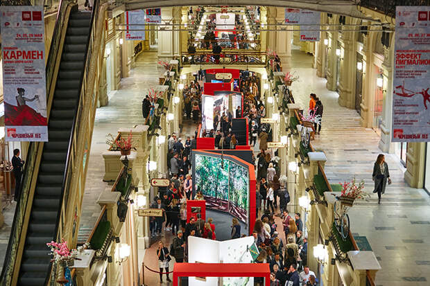 Минувшим вечером в рамках фестиваля «Черешневый лес» в ГУМе открылась масштабная выставка современного искусства ГУМ Red Line и одноименная галерея. Среди экспонатов, которые расположились в авангардных интерьерах авторства архитекторов Дмитрия Ликина и Олега Шапиро вдоль первой линии и вокруг знаменитого фонтана, можно увидеть работы 15 российских художников, среди которых AES+F, Андрей Бартенев, Павел Пепперштейн, Гоша Острецов, Георгий Тотибадзе.