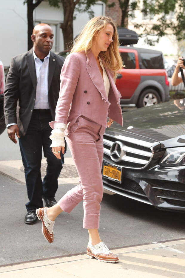 За последние несколько дней Блейк Лайвли появлялась на публике как минимум в четырех костюмах: из бархата, в клетку, полоску и неонового цвета. Видимо, актриса любит экспериментировать с классическим стилем: брюки и жакеты в ее образах присутствуют всегда, а вот материалы и цвета бывают самыми неожиданными.