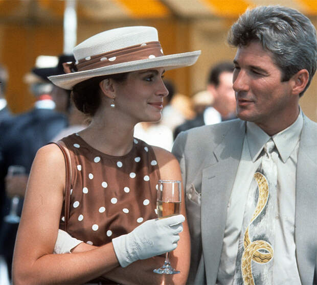 В это сложно поверить, но в следующем году и фильму «Красотка», и платью, которое символизировало начало превращения Вивиан-с-улицы в Вивиан-леди, исполнится тридцать лет. Мэрилин Ванс, художник по костюмам этого легендарного романа воспитания, рассказывает, что нашла отрез шоколадного шелка в светлый горох в одной из лавочек Беверли-Хиллз и сначала хотела повторить юбку Одри Хепберн из «Римских каникул» – широкую и до середины щиколотки, но ткани оказалось слишком мало, поэтому Джулии Робертс досталось куда менее пышное платье, чуть прикрывающее колени.