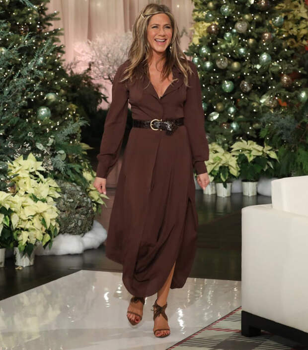 Дженнифер Энистон не часто появляется на красных дорожках и телевизионных шоу, и каждый ее выход становится событием для поклонников и модниц, которым близок лаконичный, но не лишенный трендовых деталей стиль актрисы. На днях Энистон пришла на шоу к своей подруге Эллен ДеДженерес, чтобы рассказать о новой картине "Пышка" со своим участием: для визита наша героиня выбрала макси-платье в шоколадном оттенке с пышными рукавами и широким ремнем из кожи рептилии.