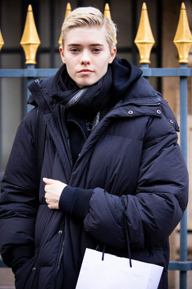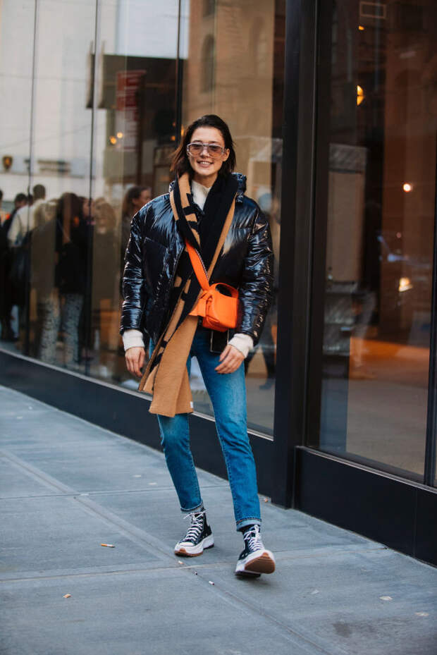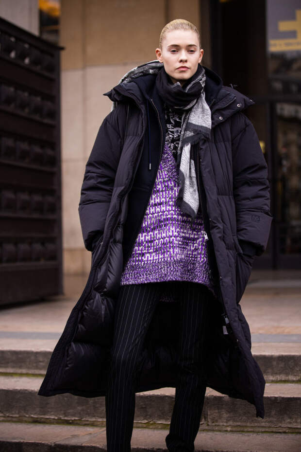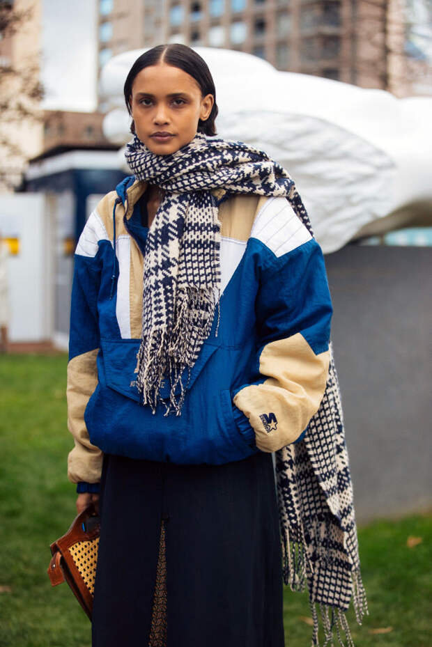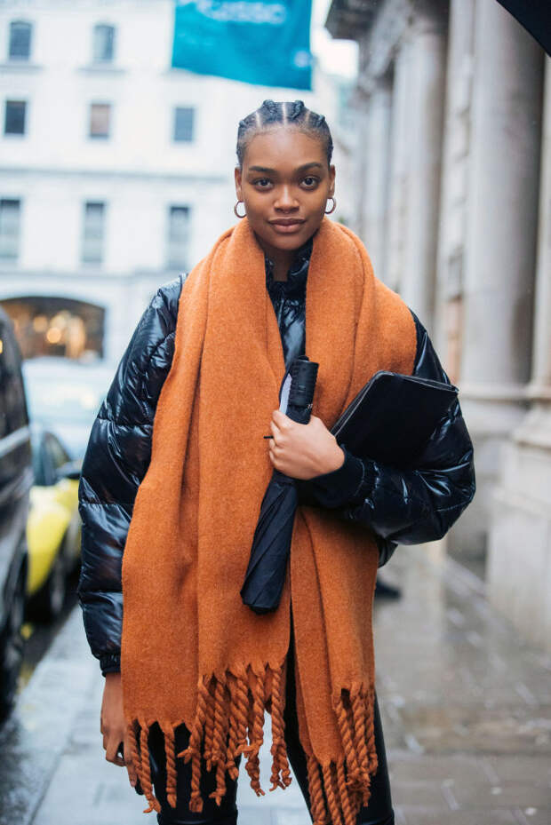 Итак, как носить шарф с пуховиком так, чтобы оставаться модной даже при температуре намного ниже нуля? Первое и главное правило: чем проще, тем лучше. Не стоит пытаться соорудить у себя на шее сложную конструкцию из многочисленных узлов по видео-урокам на YouTube. Это не всегда выглядит действительно красиво — и потом, обычно это попросту неудобно. Только представьте, как вы потом будете все это великолепие развязывать — и желание сразу же отпадет. Просто набросьте шарф на шею и перекиньте один конец через плечо — это добавит образу нужную ноту небрежности без лишних усилий. Как вариант, можно обернуть его вокруг ворота, выпустив концы вперед — смотреться будет не хуже. Если шарф вам заменяет квадратный платок, вы вполне можете свернуть его треугольником, на манер косынки, и надеть углом наружу, завязав концы сзади. Огромные шарфы-одеяла крупной вязки смотрятся стильно в любом случае — это вещь-высказывание, которая не требует какого-то особенного стайлинга. Так что с ними вообще любые усилия будут лишними — их можно даже просто набросить поверх куртки, не завязывая.