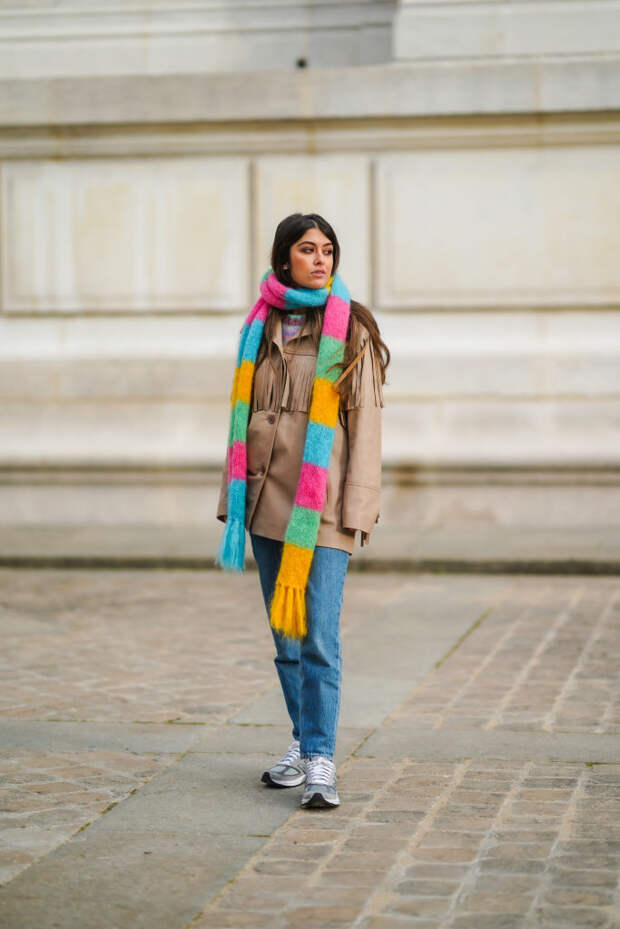Тепло ли это? Не уверены. Зато однозначно очень красиво. Если же в приоритете для вас комфорт, то лучше всего будет плотно обвязать шарф вокруг шеи и спрятать его под ворот пуховика или парки. Можно также завязать его простой петлей или узлом поверх куртки — это будет чуть более эффектный, но не менее действенный способ сохранить тепло в минусовую температуру. Что же касается цветовых комбинаций, то тут нужно четко понимать, в каком качестве вы хотите использовать свой шарф — как самостоятельный модный акцент или как логичное продолжение остального аутфита. В первом случае вы можете разбавить ярким шарфом монохромный лук в спокойных оттенках. Во втором же — либо подобрать его под цвет куртки, либо просто выбрать нейтральный тон вроде серого или бежевого, который сочетается буквально со всем. Еще один эффектный способ вписать шарф в образ — повторить в нем оттенок одной из надетых на вас вещей. Скажем, брюк или обуви. Тогда лук получится по-настоящему законченным и цельным. Ну а если вы все еще боитесь совершить ошибку в составлении своего модного комбо, мы советуем обратиться к нашей "шпаргалке" с образами главных модниц мира — они уж точно всегда подскажут, какое сочетание окажется самым выигрышным.