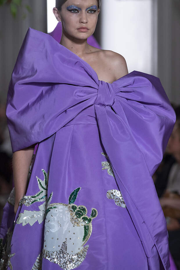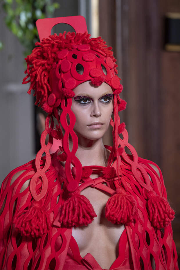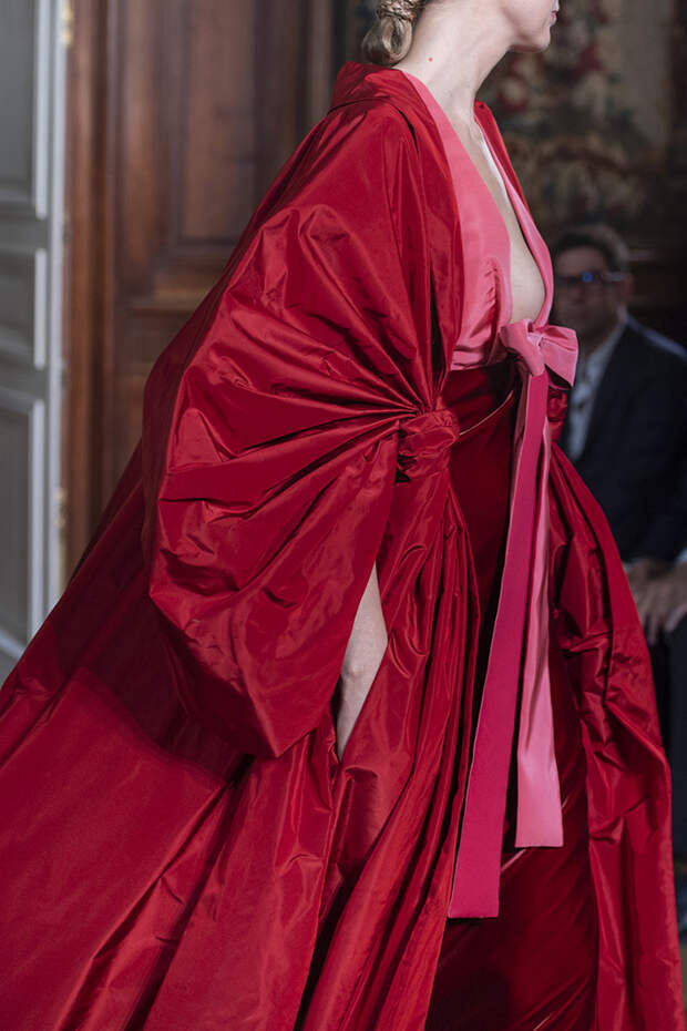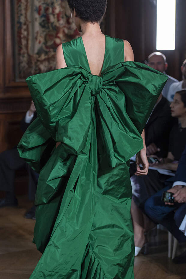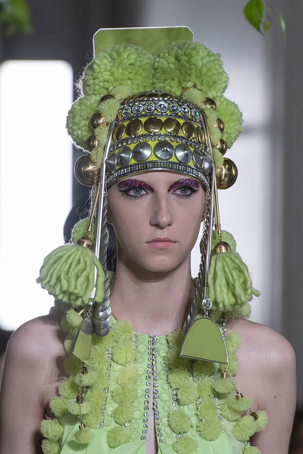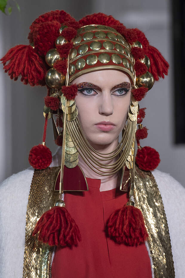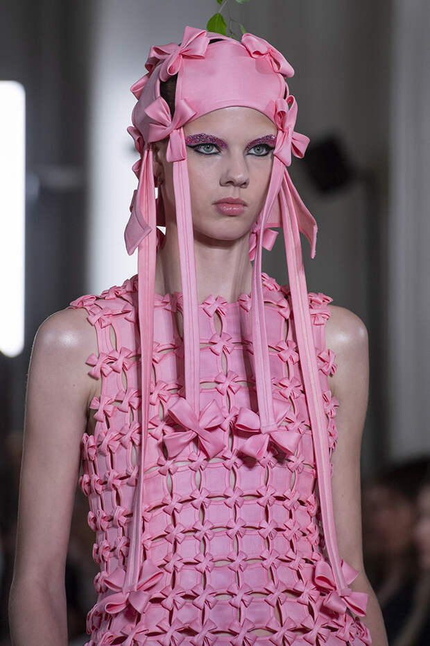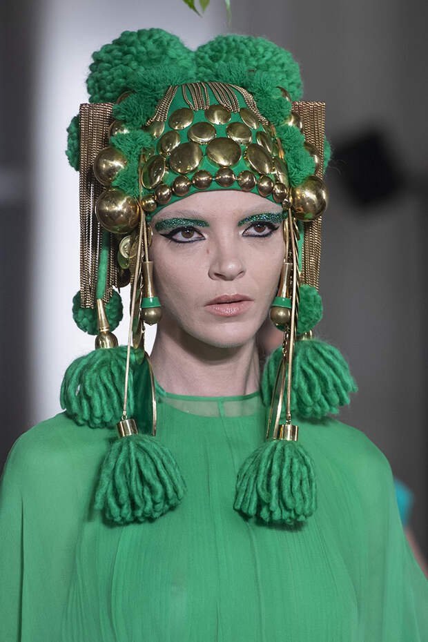 Но даже они едва могли отвлечь внимание от фантазийных головных уборов, инспирированных национальными нарядами разных стран. Здесь же фирменные банты Valentinо всех мастей и объемов, драпировки и сложные аппликации в лучших традициях haute couture.