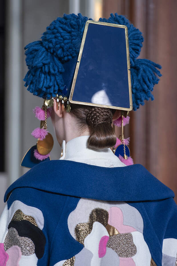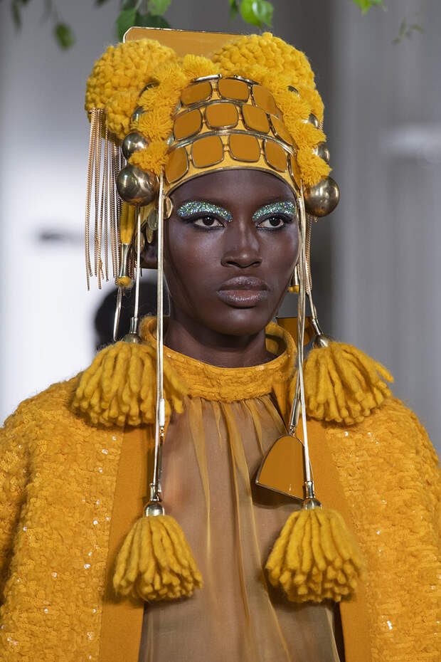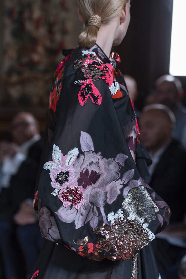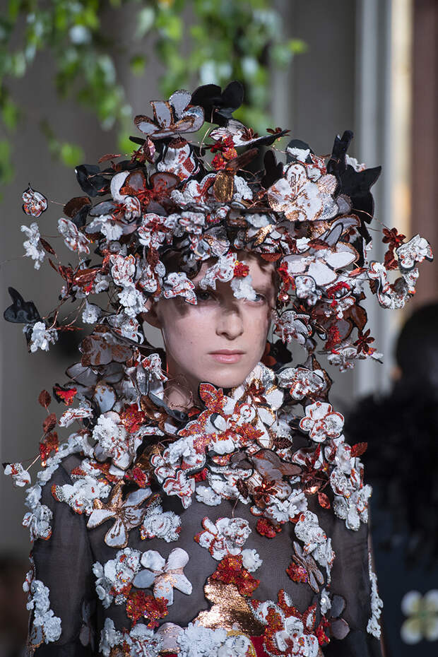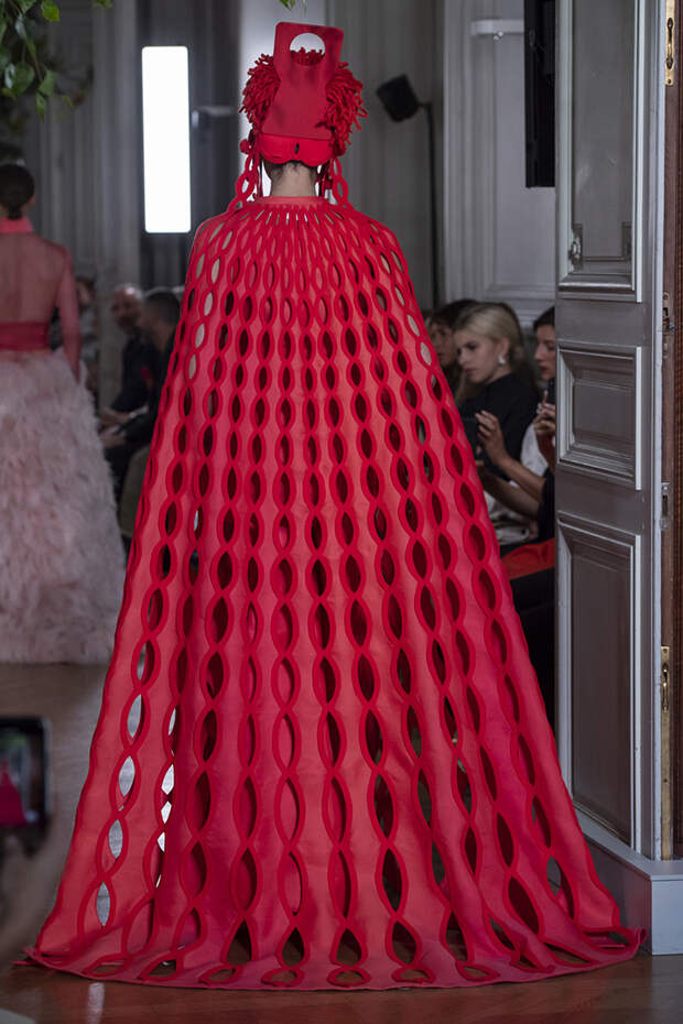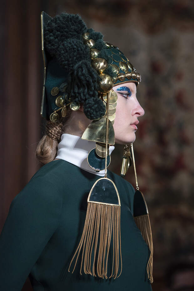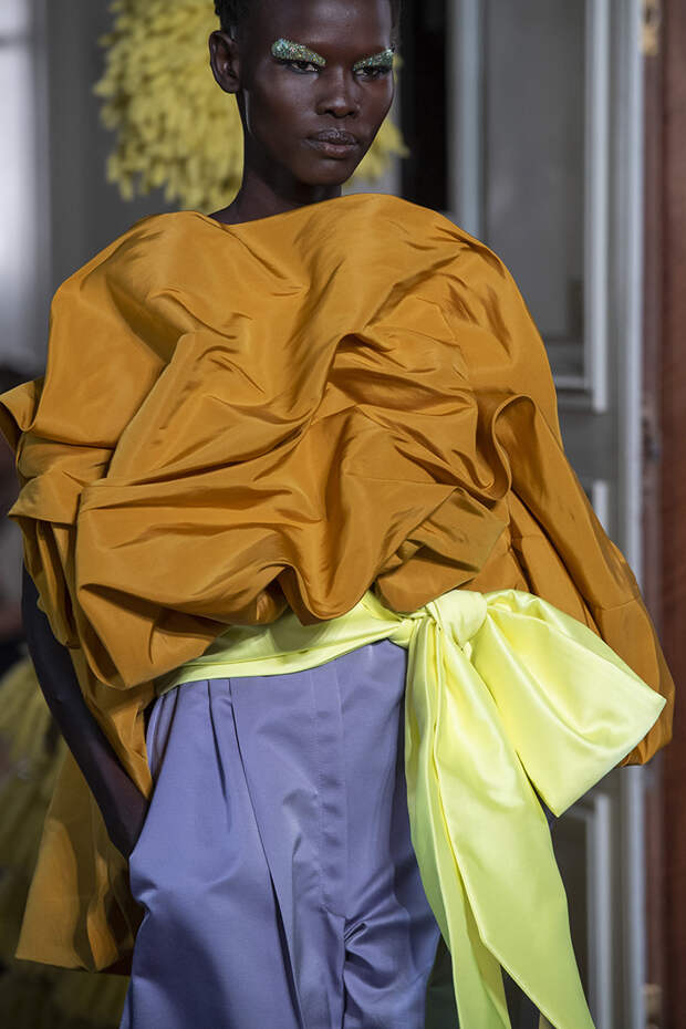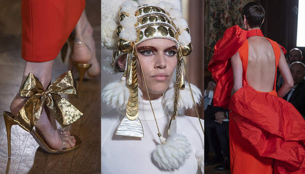 Но даже они едва могли отвлечь внимание от фантазийных головных уборов, инспирированных национальными нарядами разных стран. Здесь же фирменные банты Valentinо всех мастей и объемов, драпировки и сложные аппликации в лучших традициях haute couture.