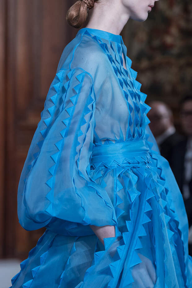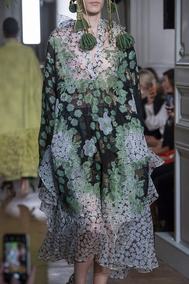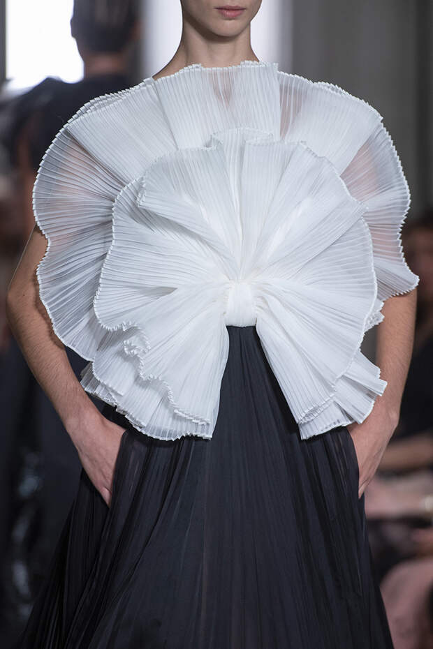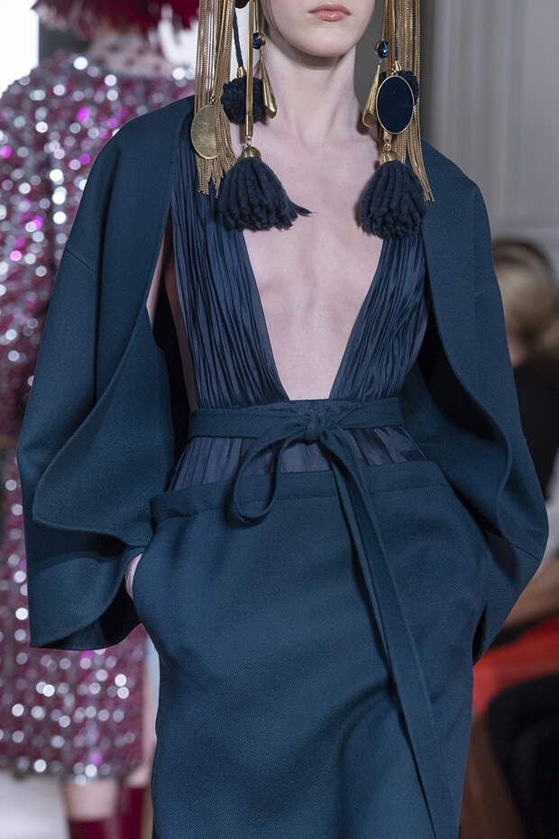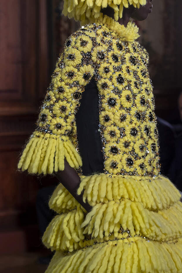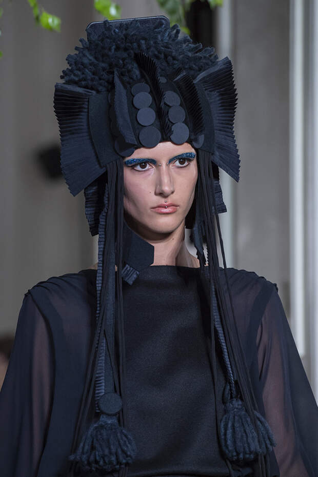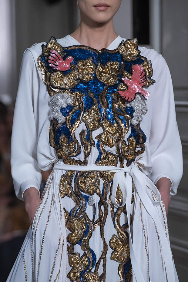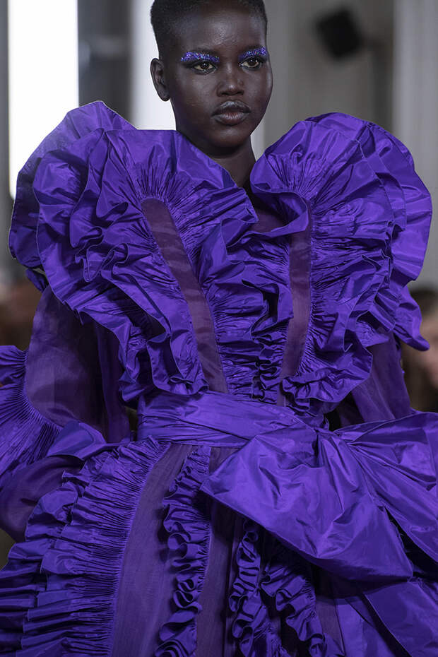 Но даже они едва могли отвлечь внимание от фантазийных головных уборов, инспирированных национальными нарядами разных стран. Здесь же фирменные банты Valentinо всех мастей и объемов, драпировки и сложные аппликации в лучших традициях haute couture.