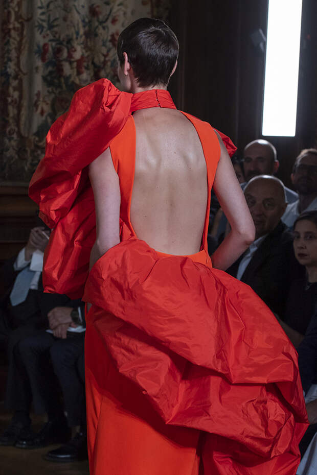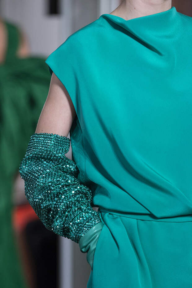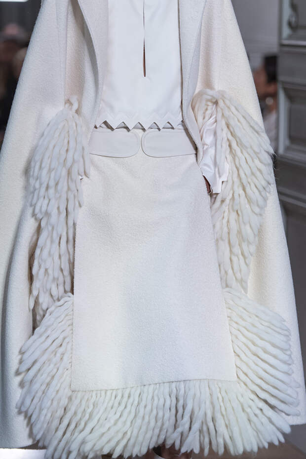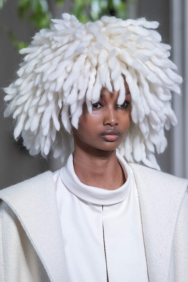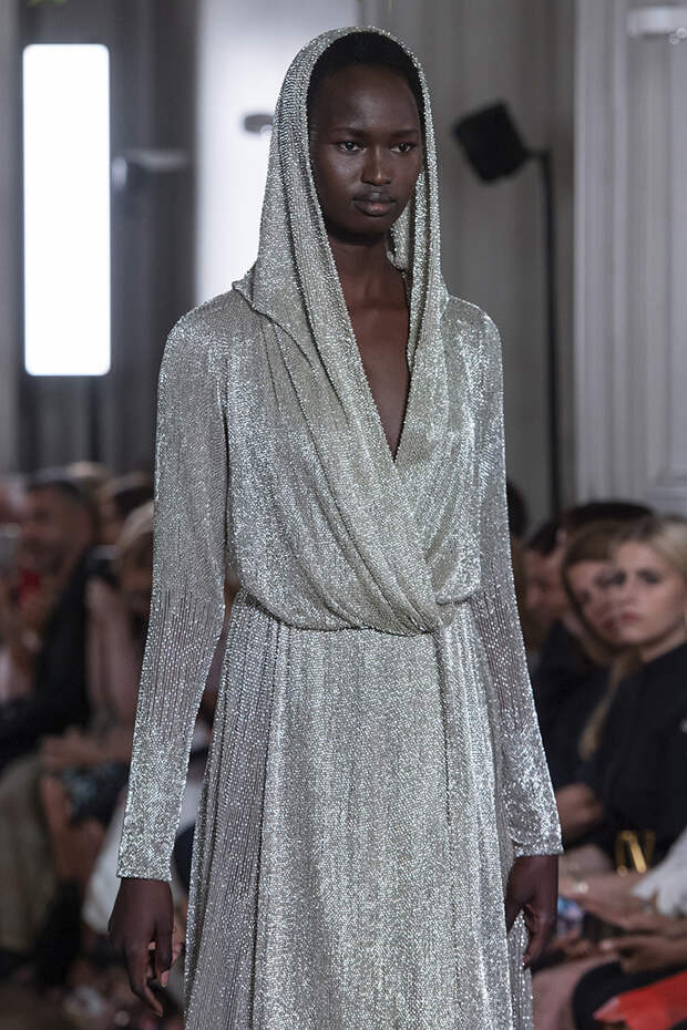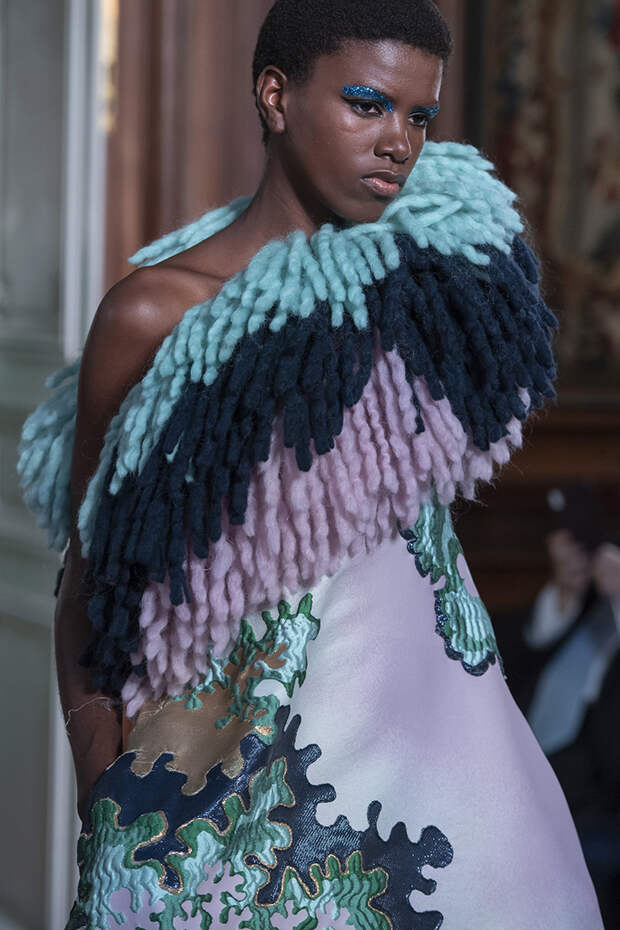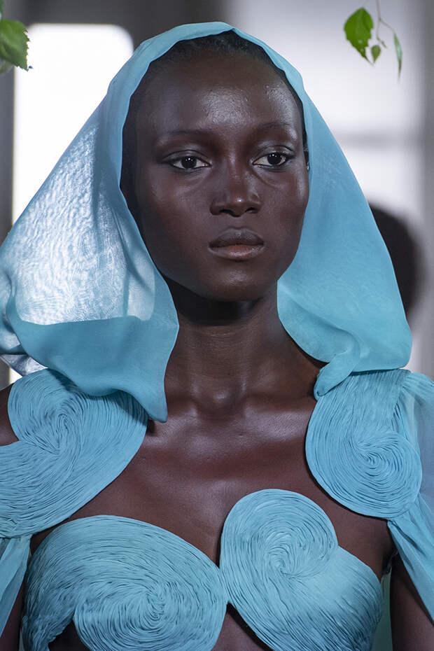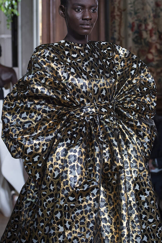 Но даже они едва могли отвлечь внимание от фантазийных головных уборов, инспирированных национальными нарядами разных стран. Здесь же фирменные банты Valentinо всех мастей и объемов, драпировки и сложные аппликации в лучших традициях haute couture.