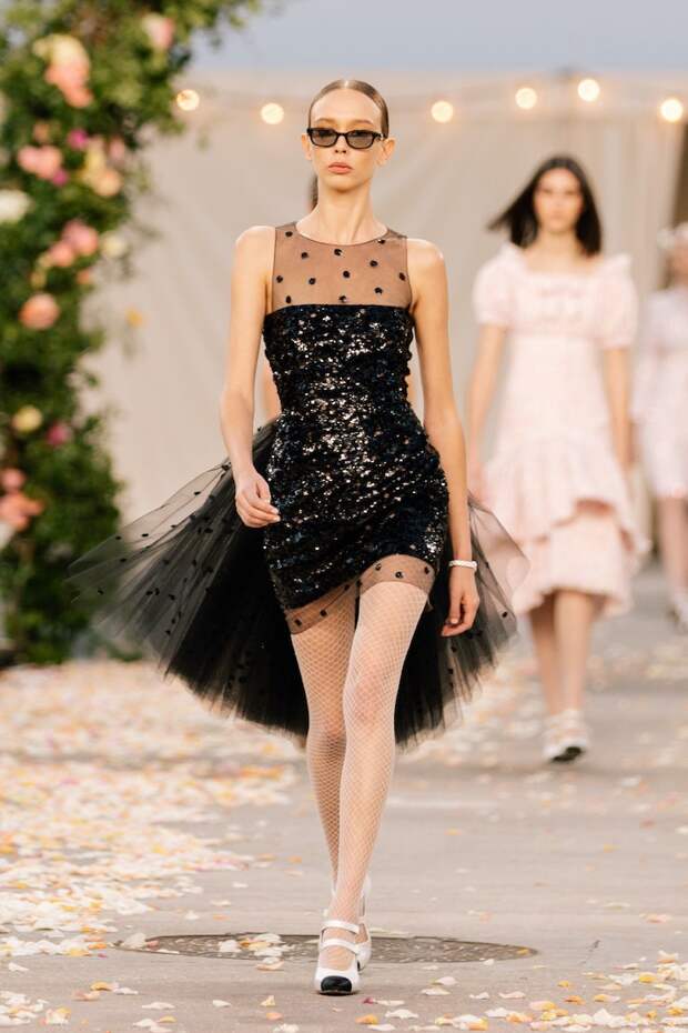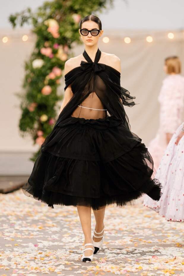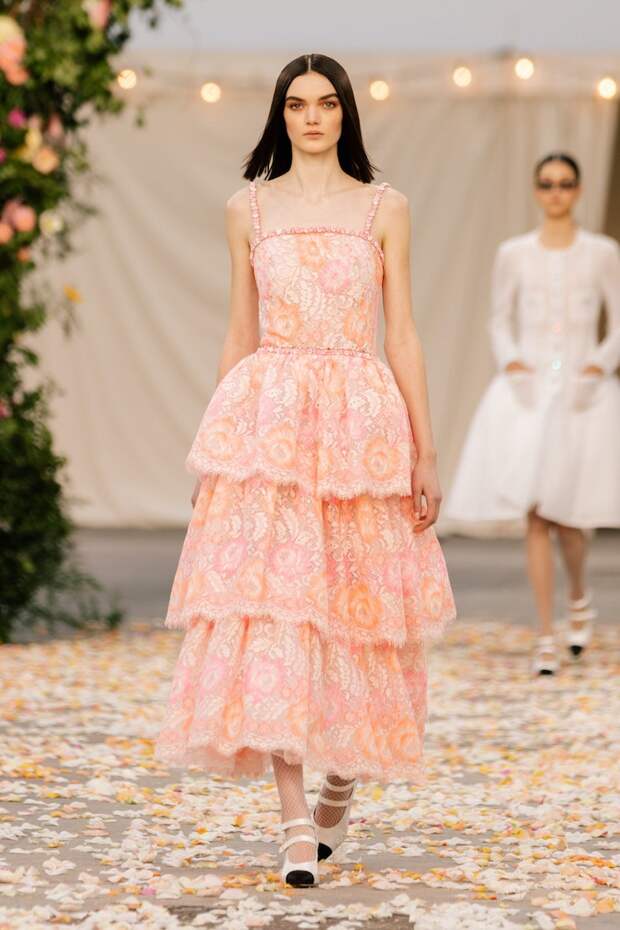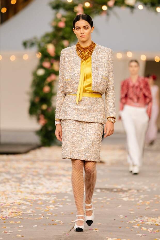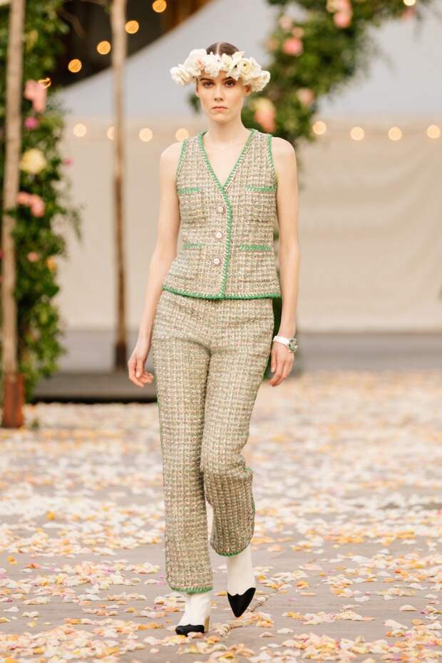 Скорее это был более богемный праздник, который организовали более юные и свободные духом джет-сеттеры (такие камерные торжества для самых близких — верная примета нашей постковидной эпохи). Все типажи гостей легко узнаваемы. Юные дебютантки, которые пришли на такое большое мероприятие впервые — в скромных монохромных платьях и туфлях на небольших устойчивых каблуках. Женщины из семей жениха и невесты в буржуазных твидовых костюмах и традиционных вечерних платьях. Подружки невесты в летящих тюлевых пачках, невесомых платьях лесных нимф и цветочных венках. Надо сказать, все они выбрали наряды, соответствующие обстановке и случаю: легкие, свежие и очень изящные. Никто не стремился перещеголять друг друга в нарядности и привлечь всеобщее внимание: все пришли сюда исключительно для того, чтобы разделить общую радость. Поэтому вместо бархата, жаккарда, парчи и тафты здесь были легкие тюль и газ, невесомый податливый шелк и полупрозрачные шифон и кружево. Даже твид — константа коллекций Chanel — стал легким, тонким и подвижным, а часть знаменитых твидовых жакетов превратилась в укороченные жилеты. Самым свежим и современным решением оказалось заменить традиционное вечернее платье на комбо из объемной шелковой рубашки и многослойной черной пачки из тюля. Это не только лучшее отражение духа времени, которое требует простоты и понятности, но и идеальное воплощение ценностей и эстетики Дома Chanel: сама легендарная Габриэль Шанель обычно стремилась искать красоту в простоте и доводить до совершенства привычные базовые вещи. Так что и простая белая сорочка вполне может стать вещью на выход — особенно если она сделана из тончайшего изысканного шелка в святая святых кутюрного ателье Chanel на Рю Камбон, 31.И, наконец, то, ради чего все и собрались: выход невесты. Она оказалась эдакой Леди Годивой и появилась перед гостями на белом коне. Правда, не обнаженной, а в подвенечном платье цвета слоновой кости из сатина, расшитого перламутровыми бабочками. Никаких платьев-тортов, кринолинов и корсетов: облегающий силуэт с чуть расклешенной книзу юбкой, длинным рукавом и воротником-стойкой. Дополнен наряд было весьма впечатляющей фатой, которая шлейфом тянулась за девушкой по подиуму, когда она наконец вышла к собравшимся в зале гостям. И, поверьте, дальновидные невесты обязательно возьмут этот вариант свадебного платья на вооружение. Хотя бы потому что за него им точно не придется краснеть даже спустя 20-30 лет после памятной даты.