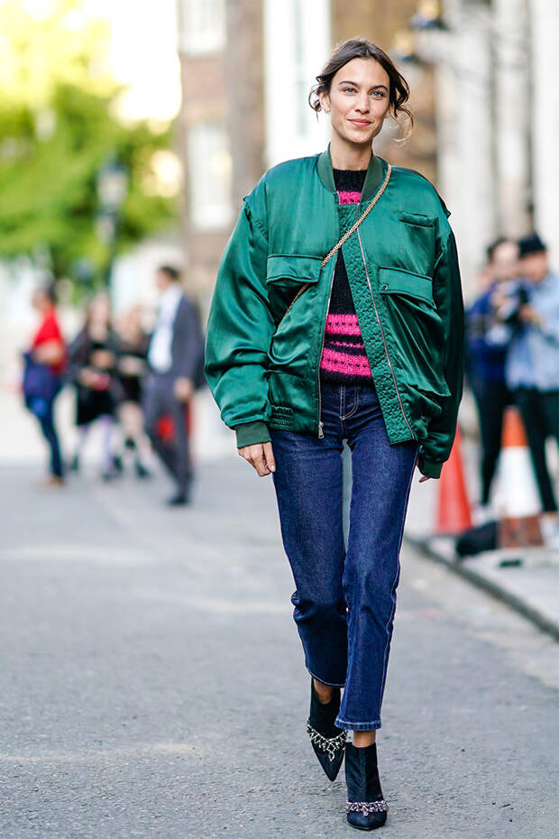 Казалось бы, бомберы канули в Лету еще несколько сезонов назад. Но Алекса Чанг, будучи иконой стиля, не придерживается массового мнения. Дизайнер появилась на показе Simone Rocha в простом, но стильном образе, который очень подходит под московские погодные условия. Девушка надела чуть расклешенные джинсы, полосатый свитер и атласный бомбер благородного цвета хаки с нарядными ботильонами с декором в виде страз.