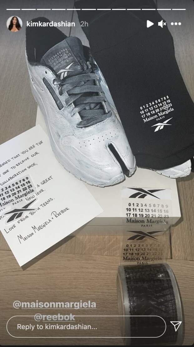 Maison Margiela и Reebok продолжают свое сотрудничество — они снова выпустили совместные кроссовки. Новая модель уже появилась в гардеробе Ким Кардашьян — знаменитость поделилась снимком сникеров в своем профиле в Instagram. Судя по всему, именно Ким получила право первой опробовать новинку — пока она не представлена даже в соцсетях самих марок.