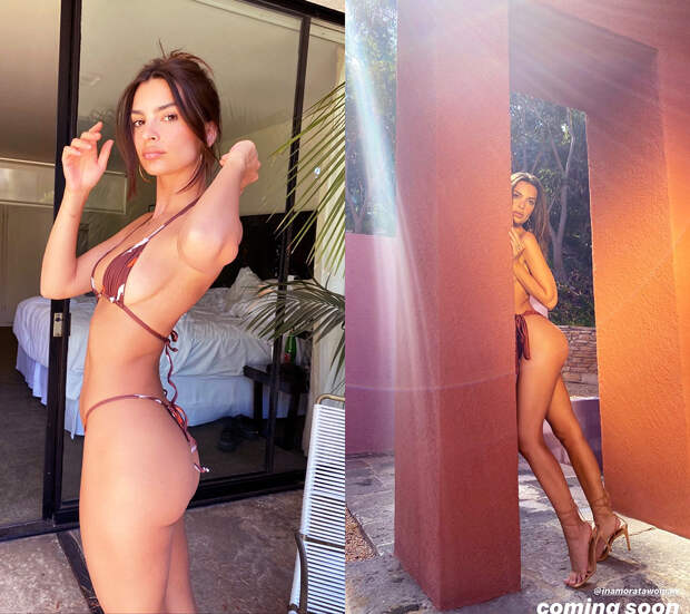 На этот раз Эмили порадовала подписчиков в сториз и разместила пару откровенных кадров, сделанных для ее бренда Inamorata. На первом фото Ратаковски примерила крошечный бикини в шоколадном оттенке, который почти не оставил простора для воображения, а затем и вовсе скинула лиф, предусмотрительно спрятавшись за прямоугольной колонной. У нас же вызывают восхищение не только изгибы Эмили, но и то, как она сочетает купальник с босоножками на шпильке и тонких тесемках.