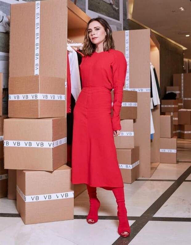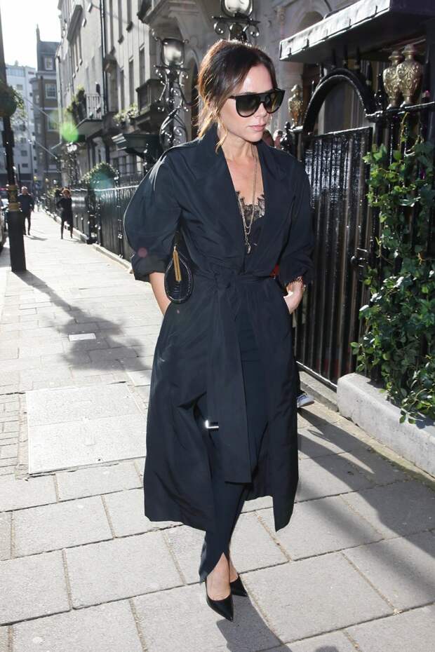 Виктория отлично знает, как сделать свои ноги бесконечно длинными, а ведь ее рост далек от модельных параметров — 163 см. Для этого супруга Дэвида Бекхэма выбирает ультрадлинные брюки клеш, закрывающие обувь на каблуке, да еще и с высокой посадкой « визуально этот прием вытягивает силуэт. А темный верх продолжает вертикаль и тоже комплиментарно работает на весь образ.