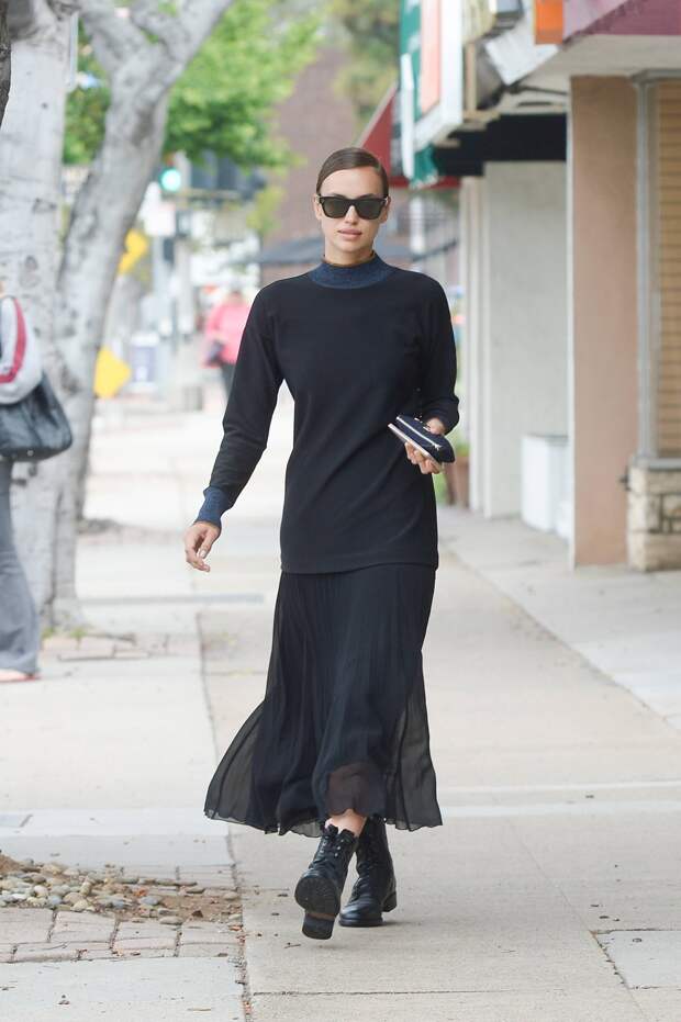 Сложно найти модницу, что носит грубые ботинки чаще Ирины Шейк. Для топ-модели, кажется, просто не существует других вариантов обуви: массивные Dr. Martens и различные их альтернативы она сочетает с романтичными летящими юбками и соблазнительными короткими платьями, свободными рваными джинсами и строгими брюками.