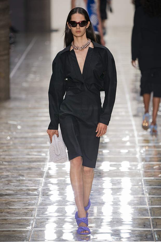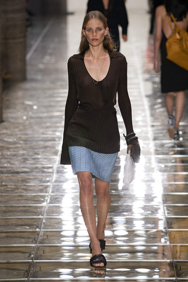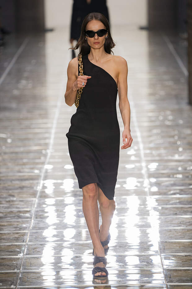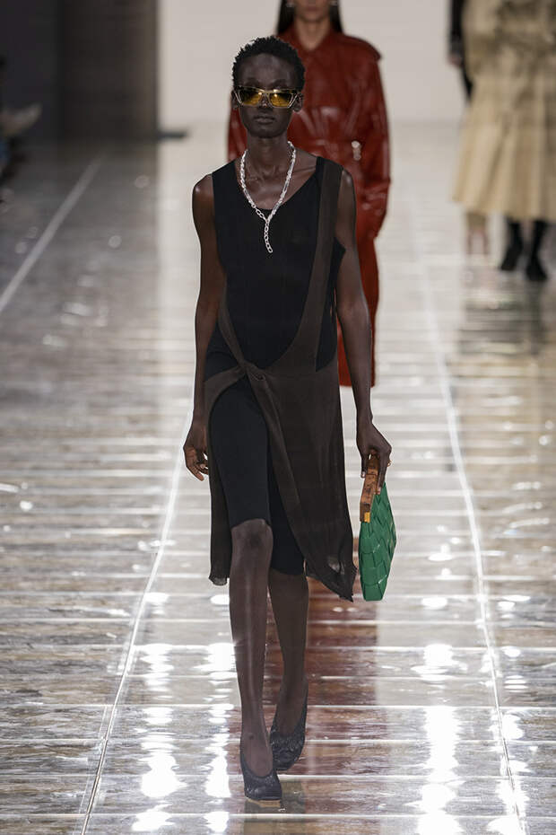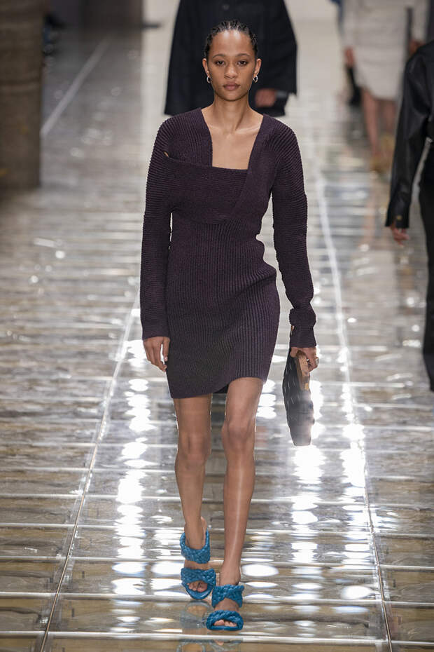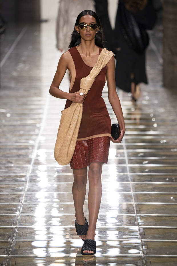 В какой-то момент дизайнер, похоже, решил, что коллекция производит слишком холодное и отстраненное впечатление — и добавил трикотажные платья, декольте которых оформлены как переплетающиеся широкие ленты в фирменном плетении Bottega Veneta. Звучит непонятно — это тот самый случай, когда увидеть один раз лучше, чем услышать хоть сто. И это действительно очень оригинальный (и уважительный) способ отдать дать уважения истории подопечного тебе дома.