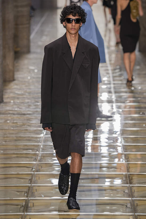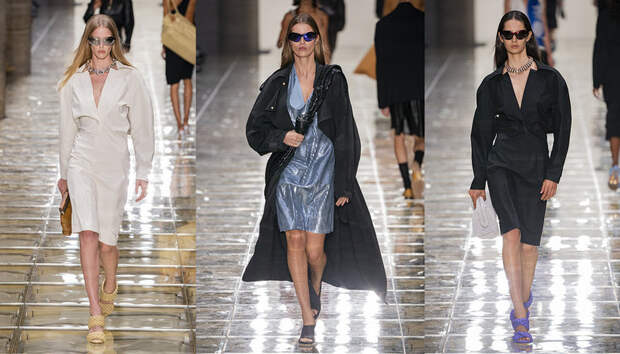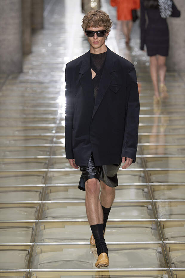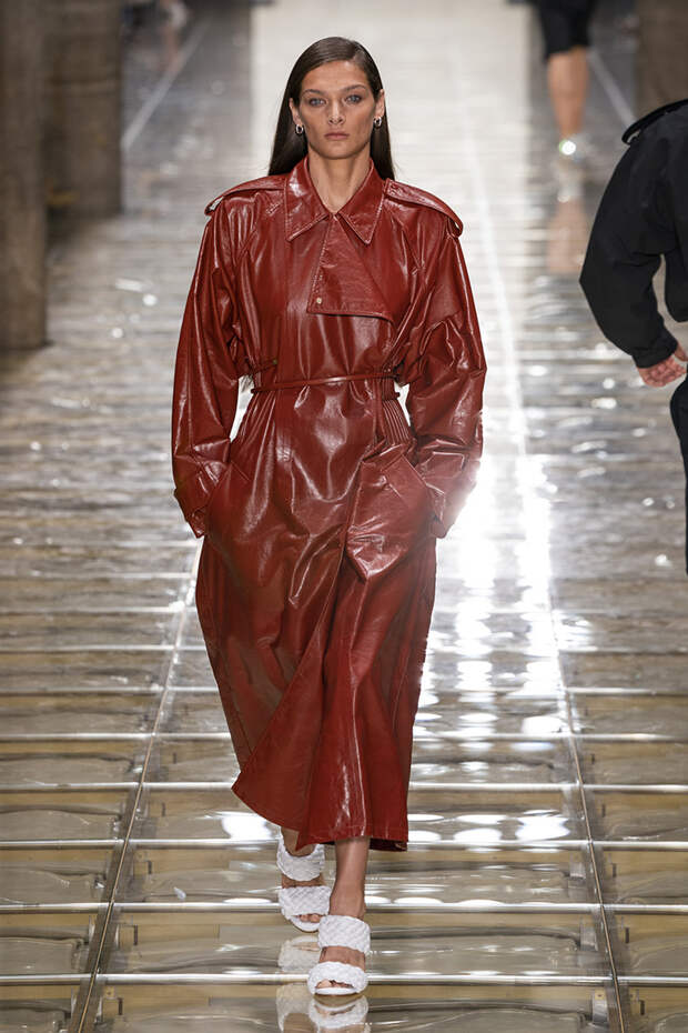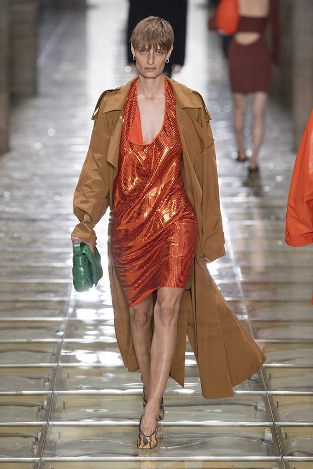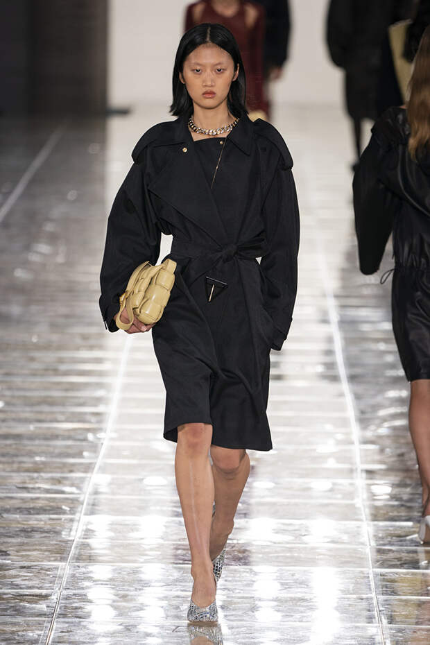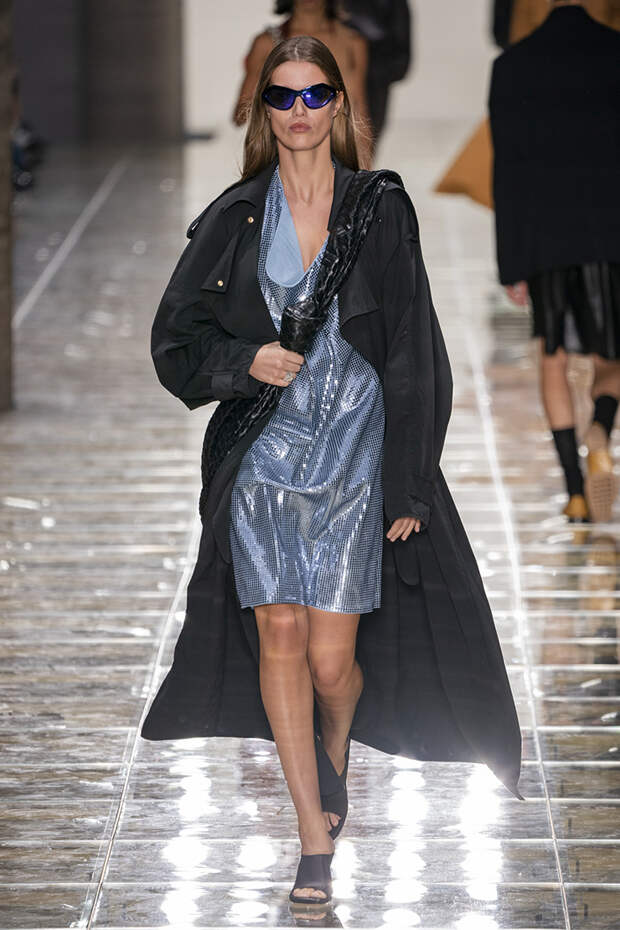 В какой-то момент дизайнер, похоже, решил, что коллекция производит слишком холодное и отстраненное впечатление — и добавил трикотажные платья, декольте которых оформлены как переплетающиеся широкие ленты в фирменном плетении Bottega Veneta. Звучит непонятно — это тот самый случай, когда увидеть один раз лучше, чем услышать хоть сто. И это действительно очень оригинальный (и уважительный) способ отдать дать уважения истории подопечного тебе дома.
