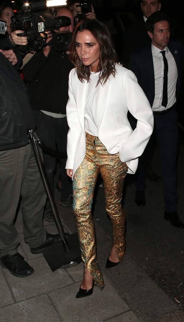 В этом году бренд Victoria Beckham празднует 10-летие. В честь первой круглой даты юбилейный показ впервые прошел в Лондоне, а не в Нью-Йорке. После триумфального шоу дизайнер решила отметить столь знаковое событие и отправилась на вечеринку. Виктория выбрала строгий силуэт, не изменяя себе. Но праздничным образ сделали "позолоченные" узкие брюки с разрезами спереди.