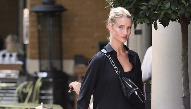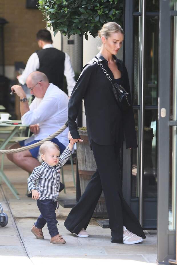 23 августа папарацци запечатлели Роузи Хантингтон-Уайтли на прогулке с сыном по Лондону. Топ-модель была одета, как всегда, удобно и со вкусом: в расклешенные черные брюки с разрезами на щиколотках, бело-розовые кеды adidas, свободную черную рубашку, будто снятую с плеча ее жениха Джейсона Стейтема, и с кожаной поясной сумкой, надетой через плечо.
