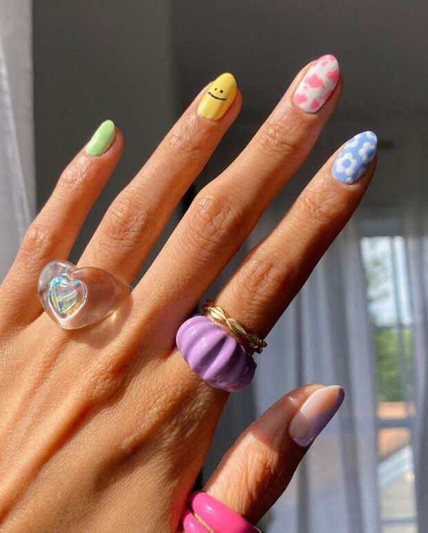 Этот тренд будто возвращает нас в детство, когда красиво — это разноцветно и с множеством мелких деталей. Простор для фантазии огромный: от минималистичных звездочек, капелек и кружочков до сложных оригинальных нейл-артов. Отличный вариант для тех, кому в жизни не хватает ярких красок.