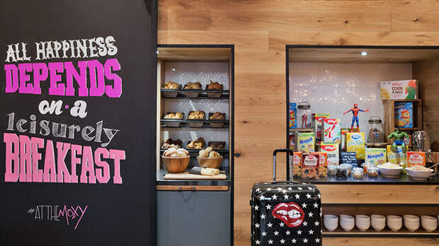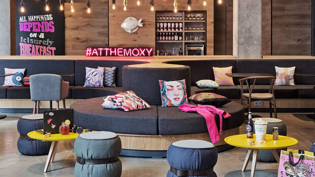 Футуристический экстерьер здесь неспроста: это часть концепции всех отелей Moxy (а к 2020 году в Европе их станет около 50). Сеть рассчитана на молодых (в том числе душой) путешественников. Отсюда современный дизайн, дружественный персонал, который встречает гостя как старого друга, а также концепция самообслуживания 24/7 B&F: перекусить и выпить в отеле можно в любое время суток, чему будет рад не только миллениал.