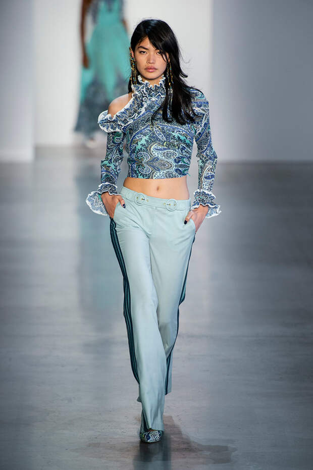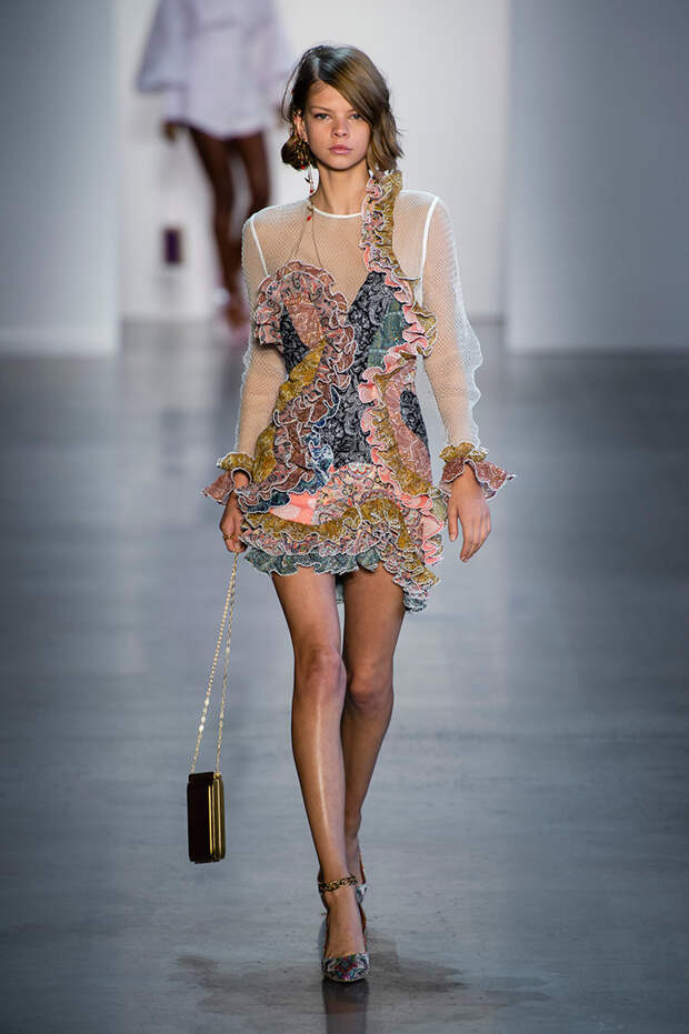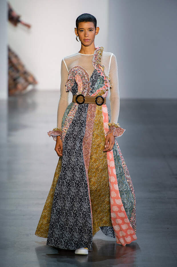 Так, в весенне-летней коллекции 2019 появился короткий топ, полностью выполненный из мелких рюшей; другой кроп-топ состоит из кружева, мелких пуговиц, с фигурными манжетами. Но центральными в коллекции оказались вещи, выполненные в технике пэчворк. Например, из небольших ровных лоскутков сделаны расклешенные брюки, а из крупных отрезков ткани — летящее платье.