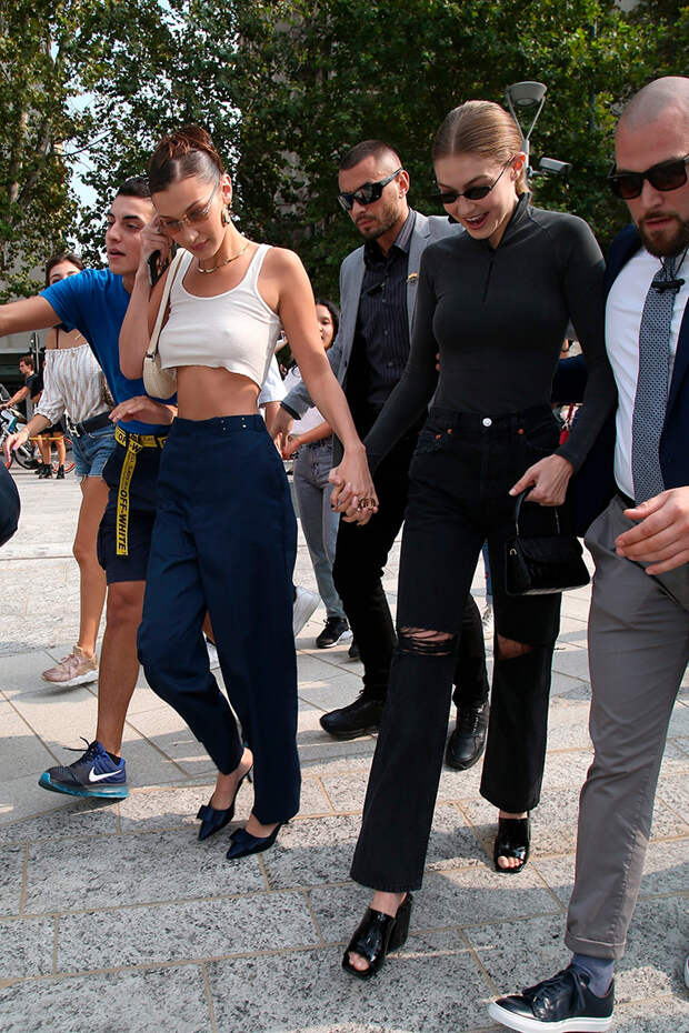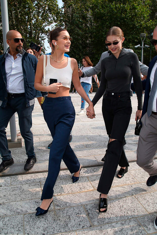 Обе выбрали широкие брюки (приготовились к пасте). Белла предпочла короткий топ (все-таки пасты будет немного), а Джиджи - водолазку на молнии. Такие разные, но вместе.