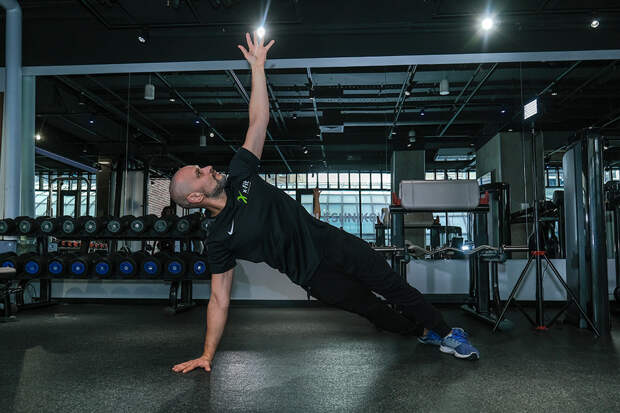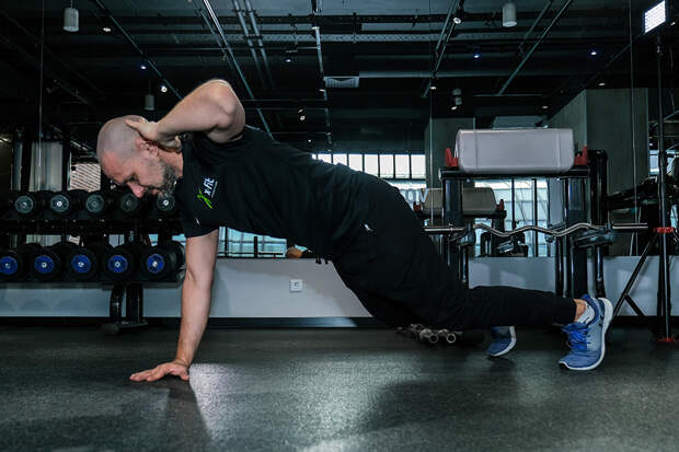 Из положения боковой планки (опорная ладонь под плечом, шея в продолжении позвоночника, стопы, таз и голова на одной линии) развернуть все тело на 90 градусов (включая стопы), не касаясь рукой пола, после чего вернуться в боковую планку. Работать в среднем темпе в течение 90-120 секунд, после чего перейти к работе на другой руке.