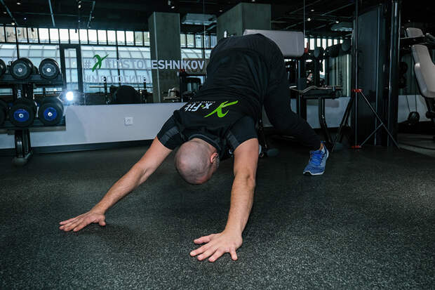Исходное положение – планка с широко поставленными ладонями. Опустить грудную клетку к полу, направляя локти в стороны, а движение вверх продолжить тазом, сгибая торс и вытягивая плечи к бедрам (собака мордой вниз). Упражнение выполняется в течение 15-20 раз в медленном темпе одним подходом.