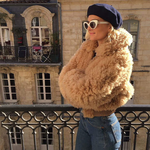 Шубы из "чебурашки" и овчины выбирают не только модные француженки, но и звезды по всему миру. Модницы Франции, правда, носят их более практично: лучшее сочетание — с простыми голубыми джинсами. Теплой осенью к образу можно добавить ретро-очки и берет.