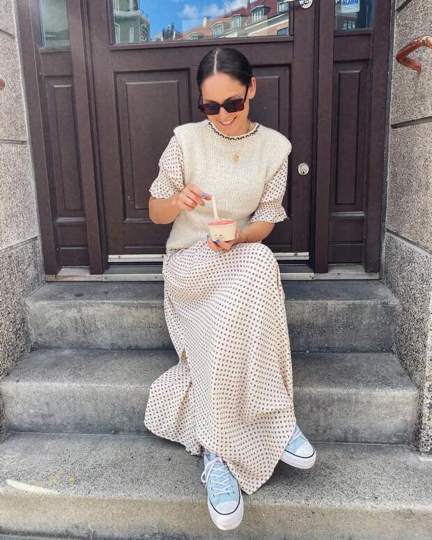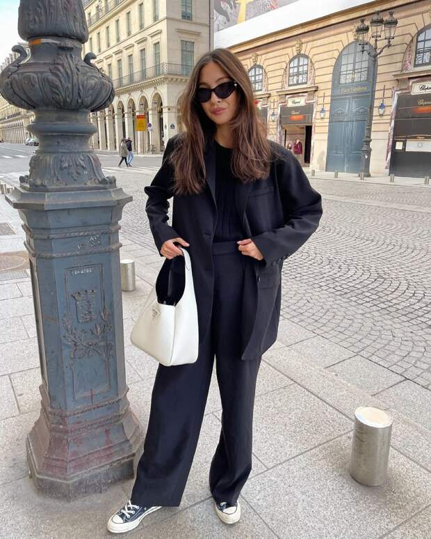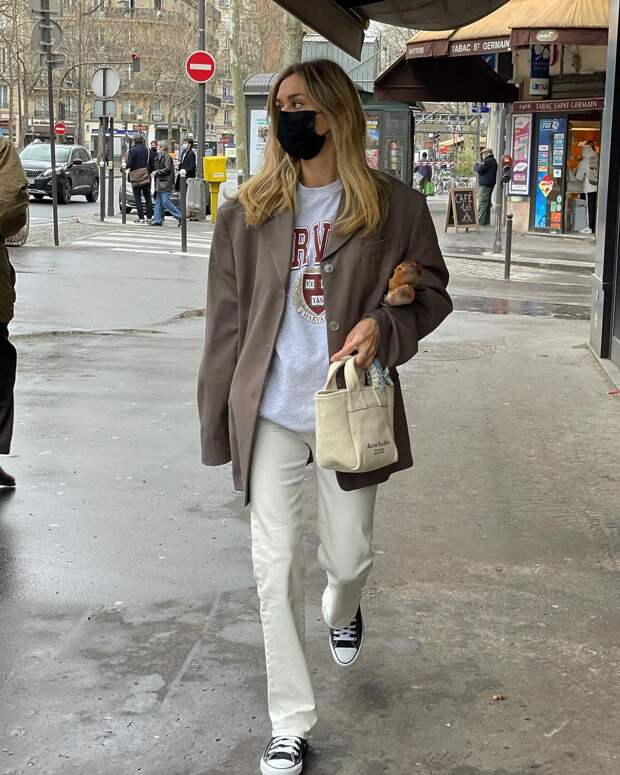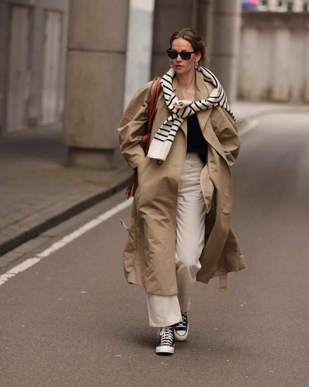 В качестве более расслабленного варианта для прогулок блогеры рассматривают аутфиты с кедами, джинсами и пиджаком, который можно позаимствовать у своей офисной «двойки». А популярный нынешней весной песочный классический тренч тоже прекрасно вольется в образ с «конверсами».