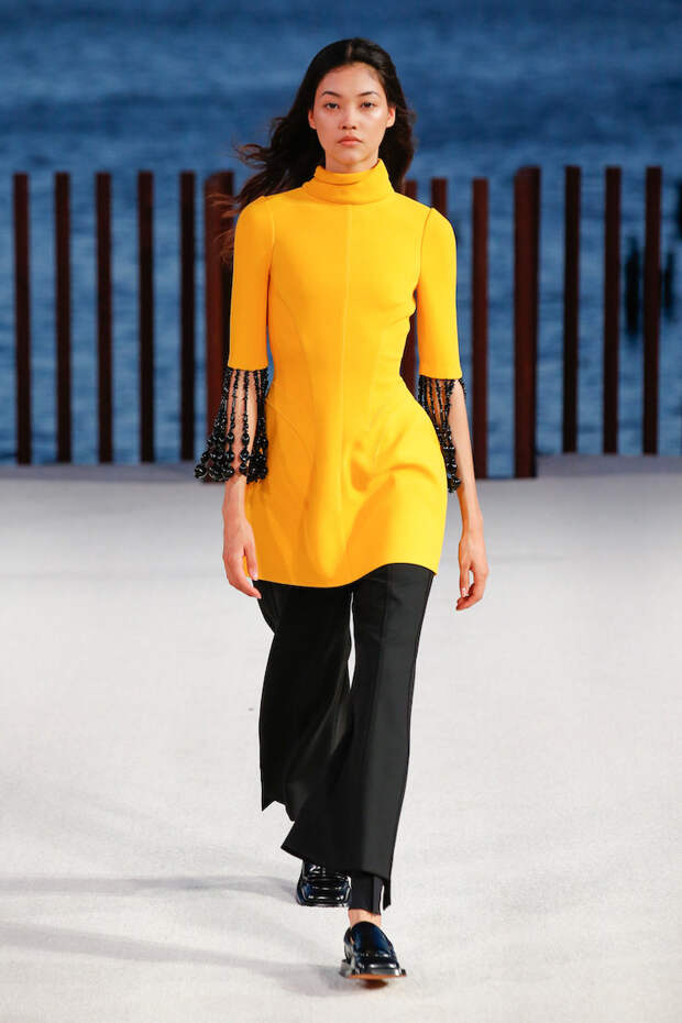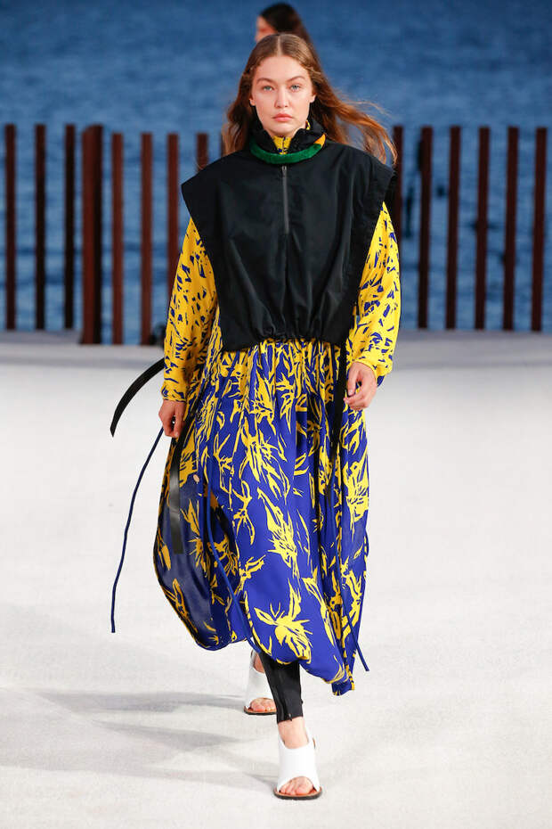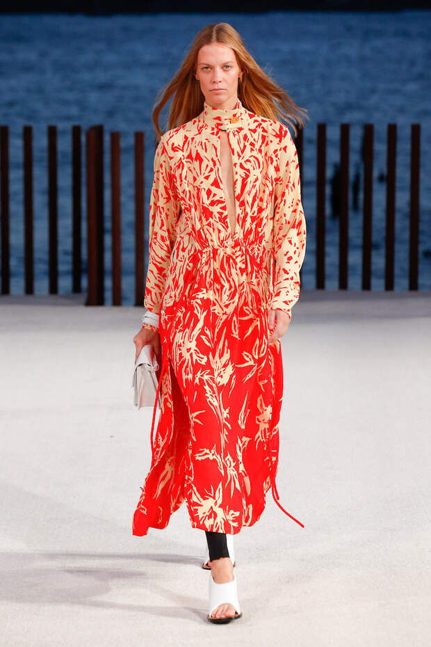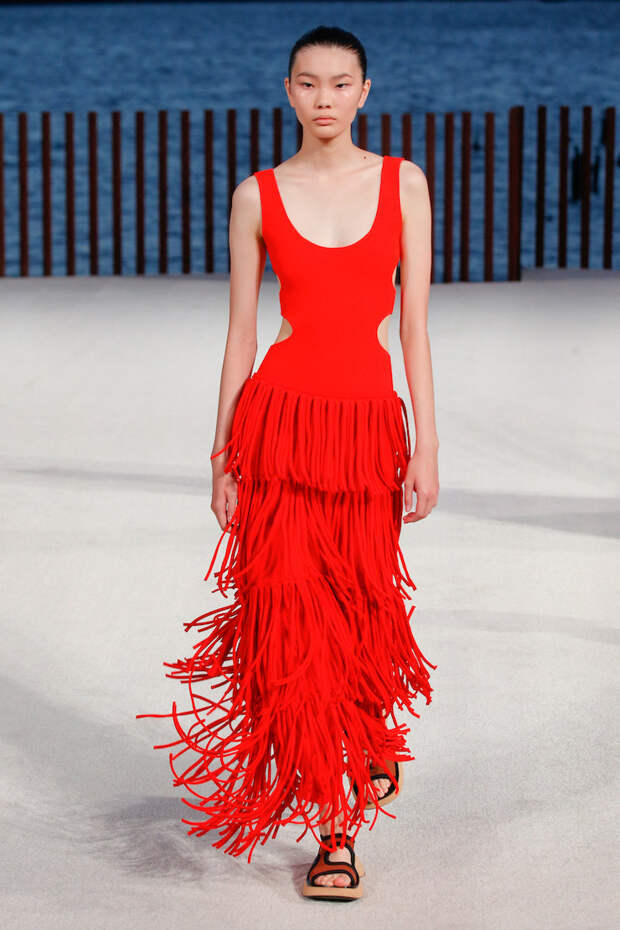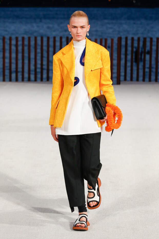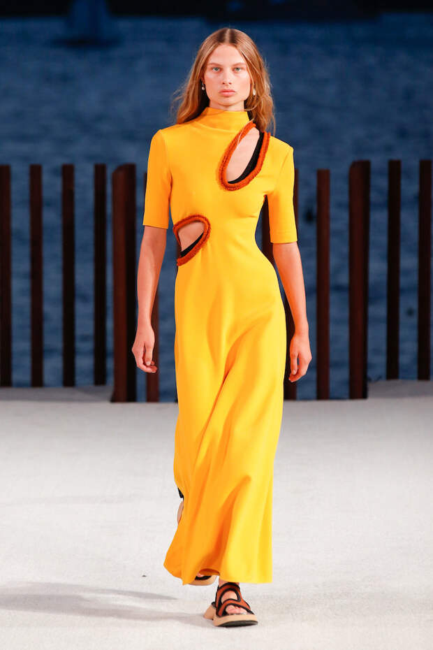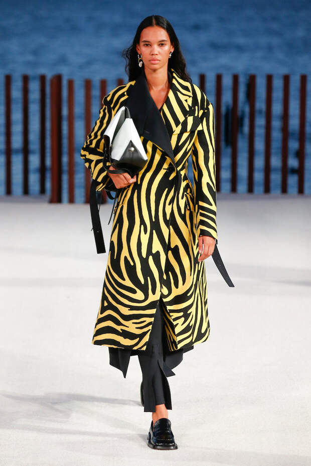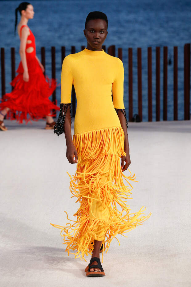 В новой коллекции марки появилось непривычно много ярких, «витаминных» цветов: апельсиновый, лимонный, огненно-красный, фуксия. Даже анималистичный принт «под зебру» у дизайнеров в этот раз получился не черно-белым, а цветным, практически в духе поп-арта. Это именно то, что нужно после года заточения в четырех стенах: такие оттенки кому угодно поднимут настроение. А вот в части силуэтов они остались верны сами себе: на подиуме мы увидели все, за что любим Proenza Schouler: объемную верхнюю одежду, облегающие трикотажные платья, брючные костюмы с приталенными жакетами, геометричные вырезы в самых неожиданных местах и летящие платья-кейпы. Интересной деталью стала бахрома, которая появилась и на многослойных трикотажных платьях, и на рукавах топов, и даже на велосипедках. Также дизайнеры вдохновились идеей отпуска на тропическом острове — отсюда в коллекции появились яркие тропические принты с цветами и листьями. Кастинг тоже заслуживал внимания: по подиуму прошлись молодая мама Джиджи Хадид и новая любимица дизайнеров — падчерица вице-президента США Камалы Харрис, Элла Эмхофф.