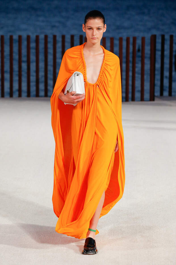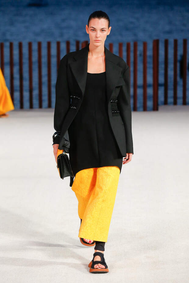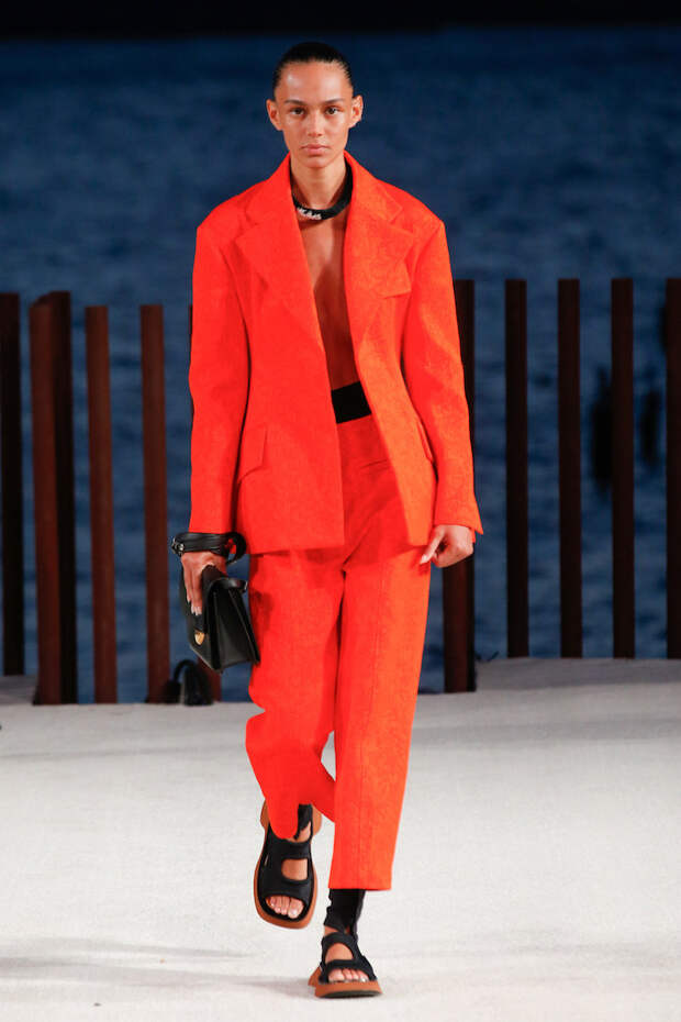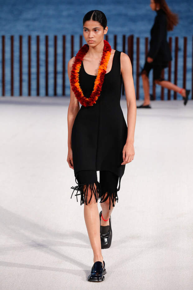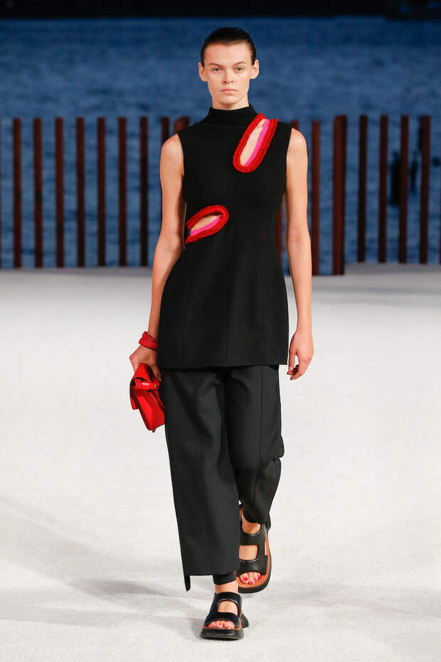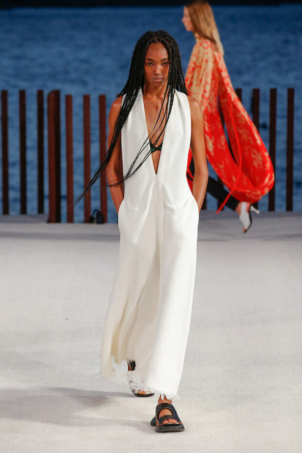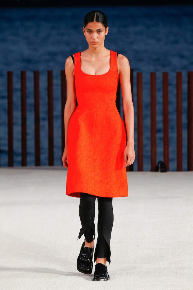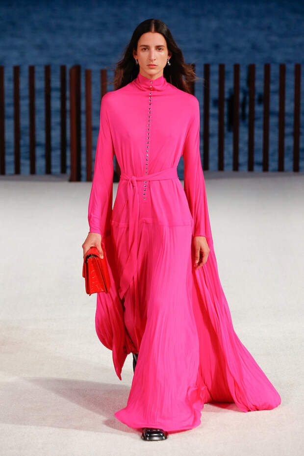 В новой коллекции марки появилось непривычно много ярких, «витаминных» цветов: апельсиновый, лимонный, огненно-красный, фуксия. Даже анималистичный принт «под зебру» у дизайнеров в этот раз получился не черно-белым, а цветным, практически в духе поп-арта. Это именно то, что нужно после года заточения в четырех стенах: такие оттенки кому угодно поднимут настроение. А вот в части силуэтов они остались верны сами себе: на подиуме мы увидели все, за что любим Proenza Schouler: объемную верхнюю одежду, облегающие трикотажные платья, брючные костюмы с приталенными жакетами, геометричные вырезы в самых неожиданных местах и летящие платья-кейпы. Интересной деталью стала бахрома, которая появилась и на многослойных трикотажных платьях, и на рукавах топов, и даже на велосипедках. Также дизайнеры вдохновились идеей отпуска на тропическом острове — отсюда в коллекции появились яркие тропические принты с цветами и листьями. Кастинг тоже заслуживал внимания: по подиуму прошлись молодая мама Джиджи Хадид и новая любимица дизайнеров — падчерица вице-президента США Камалы Харрис, Элла Эмхофф.