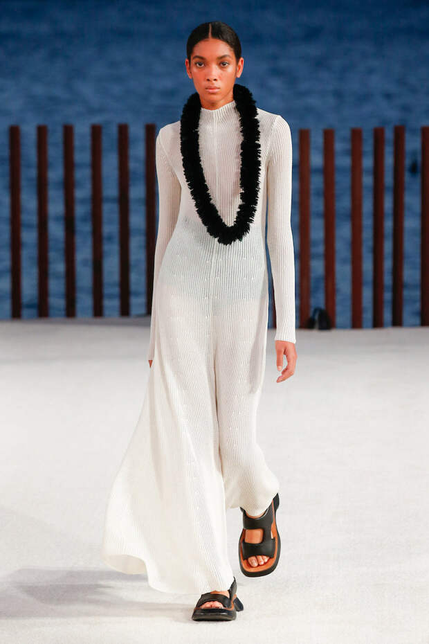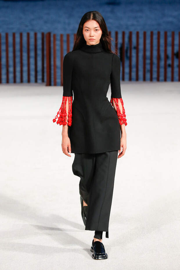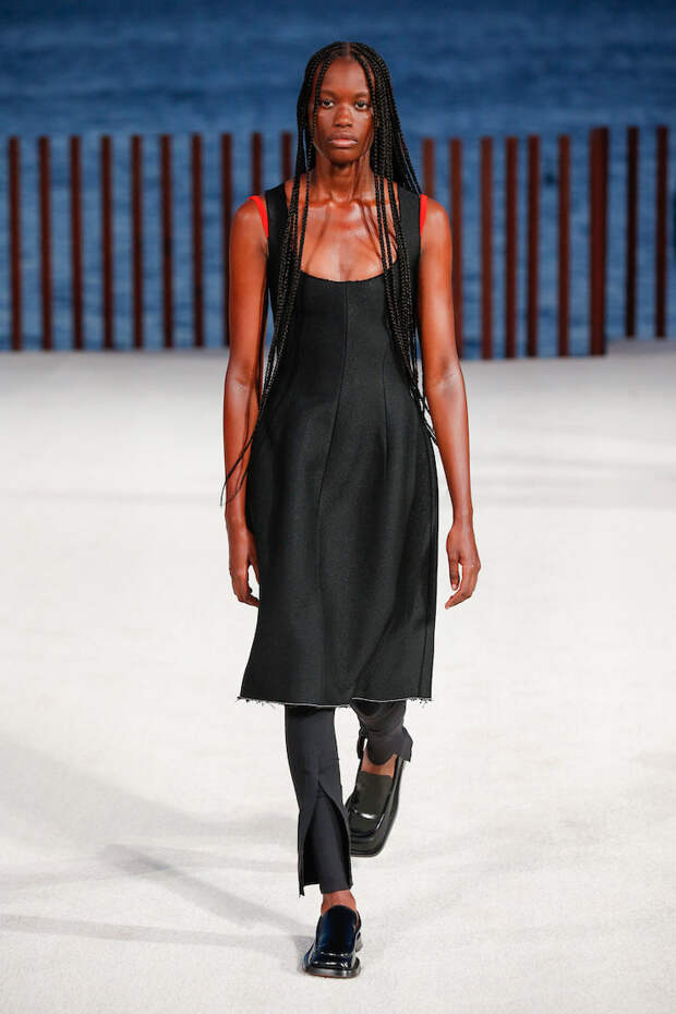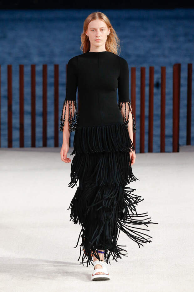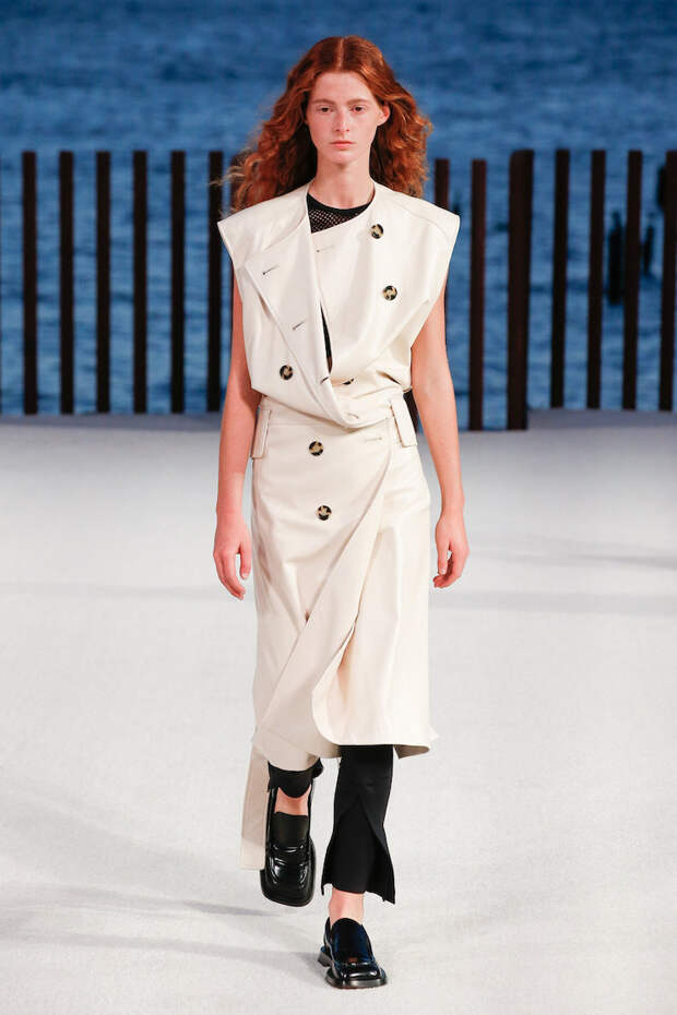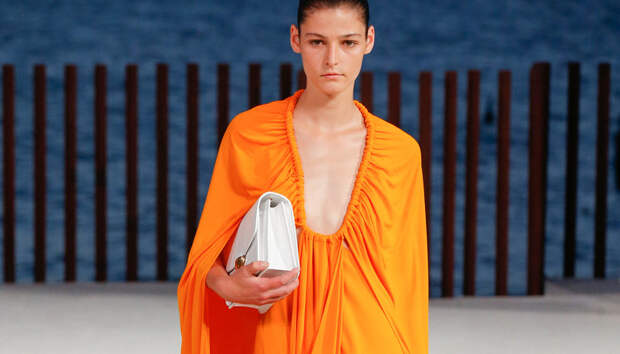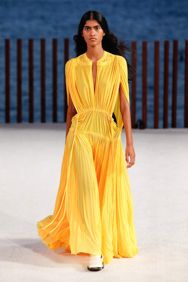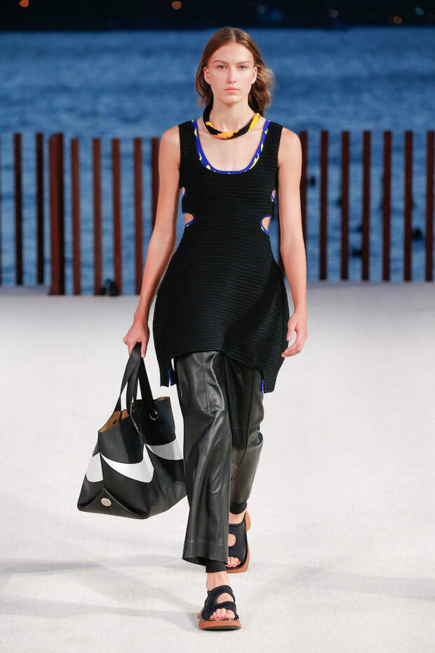 В новой коллекции марки появилось непривычно много ярких, «витаминных» цветов: апельсиновый, лимонный, огненно-красный, фуксия. Даже анималистичный принт «под зебру» у дизайнеров в этот раз получился не черно-белым, а цветным, практически в духе поп-арта. Это именно то, что нужно после года заточения в четырех стенах: такие оттенки кому угодно поднимут настроение. А вот в части силуэтов они остались верны сами себе: на подиуме мы увидели все, за что любим Proenza Schouler: объемную верхнюю одежду, облегающие трикотажные платья, брючные костюмы с приталенными жакетами, геометричные вырезы в самых неожиданных местах и летящие платья-кейпы. Интересной деталью стала бахрома, которая появилась и на многослойных трикотажных платьях, и на рукавах топов, и даже на велосипедках. Также дизайнеры вдохновились идеей отпуска на тропическом острове — отсюда в коллекции появились яркие тропические принты с цветами и листьями. Кастинг тоже заслуживал внимания: по подиуму прошлись молодая мама Джиджи Хадид и новая любимица дизайнеров — падчерица вице-президента США Камалы Харрис, Элла Эмхофф.