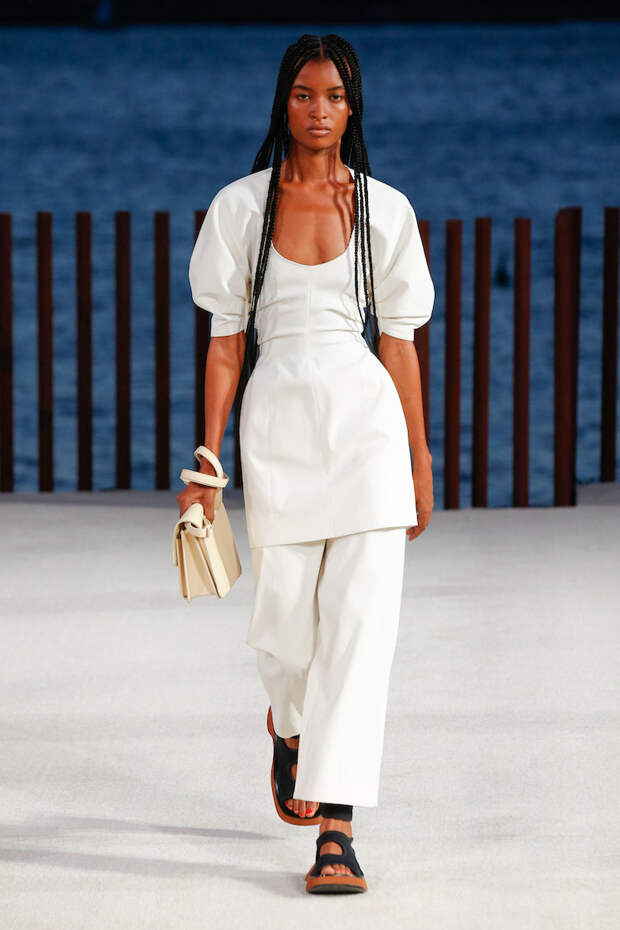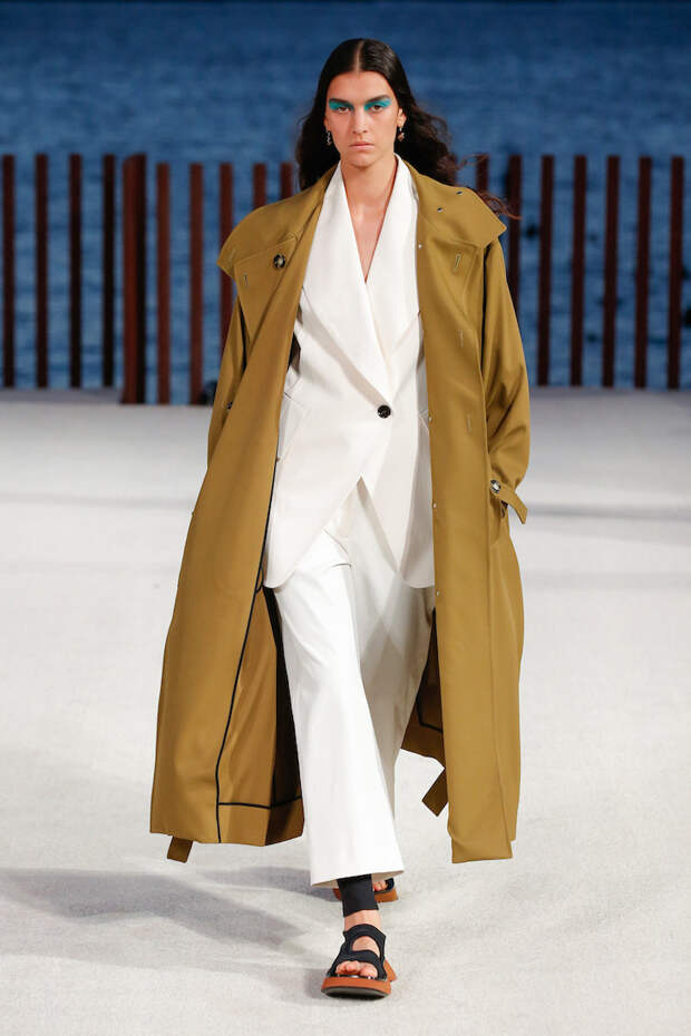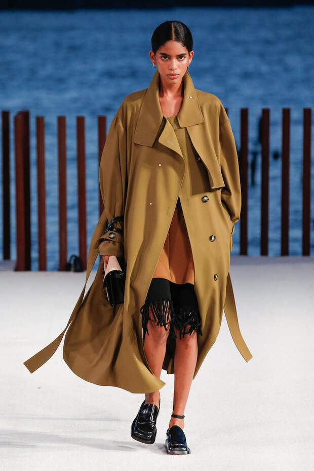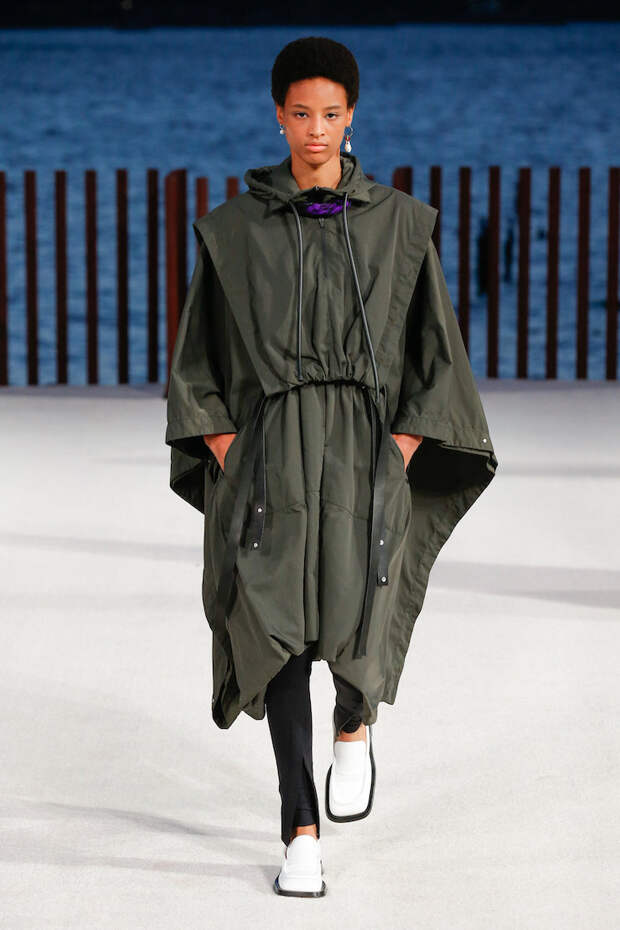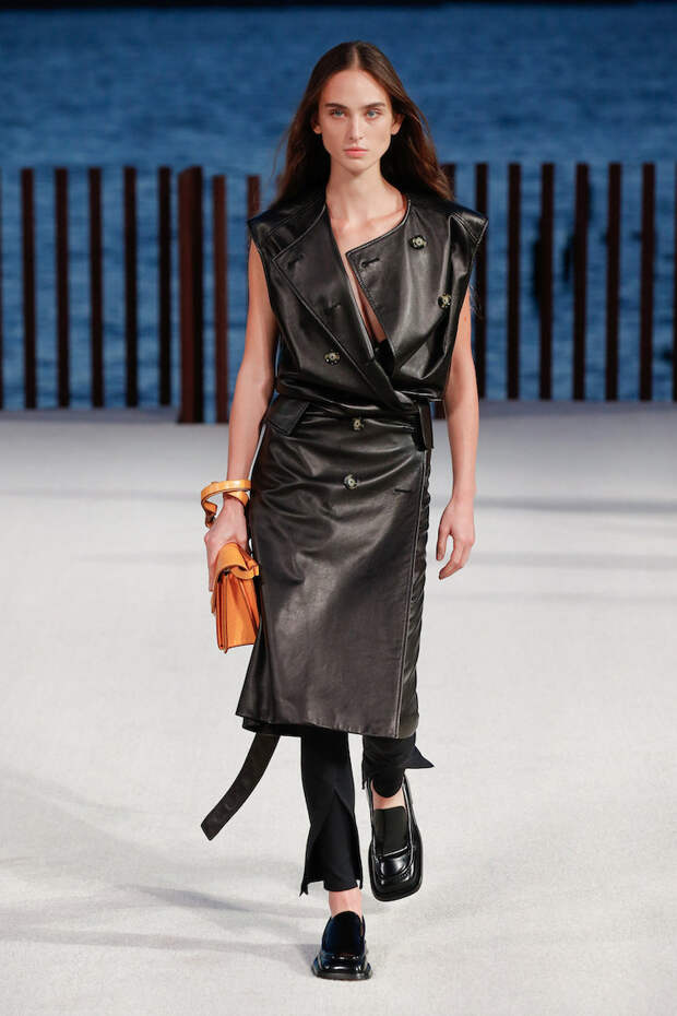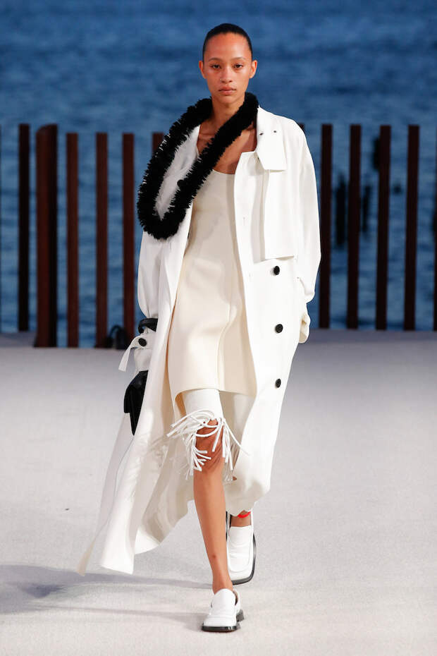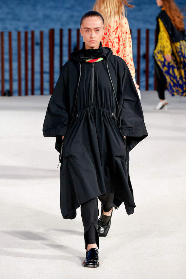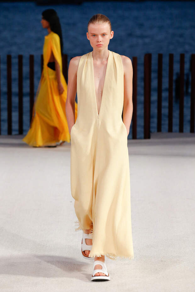 В новой коллекции марки появилось непривычно много ярких, «витаминных» цветов: апельсиновый, лимонный, огненно-красный, фуксия. Даже анималистичный принт «под зебру» у дизайнеров в этот раз получился не черно-белым, а цветным, практически в духе поп-арта. Это именно то, что нужно после года заточения в четырех стенах: такие оттенки кому угодно поднимут настроение. А вот в части силуэтов они остались верны сами себе: на подиуме мы увидели все, за что любим Proenza Schouler: объемную верхнюю одежду, облегающие трикотажные платья, брючные костюмы с приталенными жакетами, геометричные вырезы в самых неожиданных местах и летящие платья-кейпы. Интересной деталью стала бахрома, которая появилась и на многослойных трикотажных платьях, и на рукавах топов, и даже на велосипедках. Также дизайнеры вдохновились идеей отпуска на тропическом острове — отсюда в коллекции появились яркие тропические принты с цветами и листьями. Кастинг тоже заслуживал внимания: по подиуму прошлись молодая мама Джиджи Хадид и новая любимица дизайнеров — падчерица вице-президента США Камалы Харрис, Элла Эмхофф.