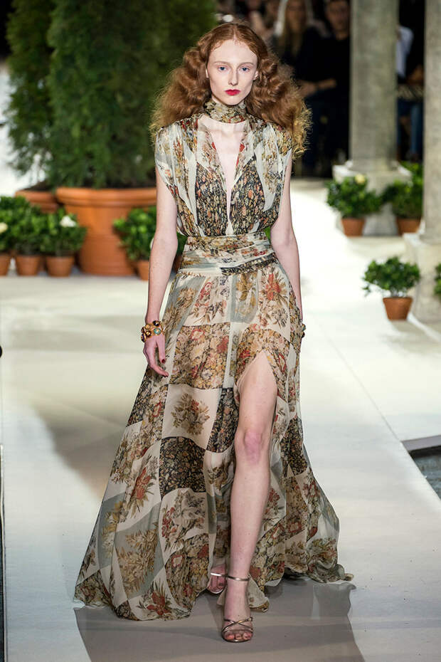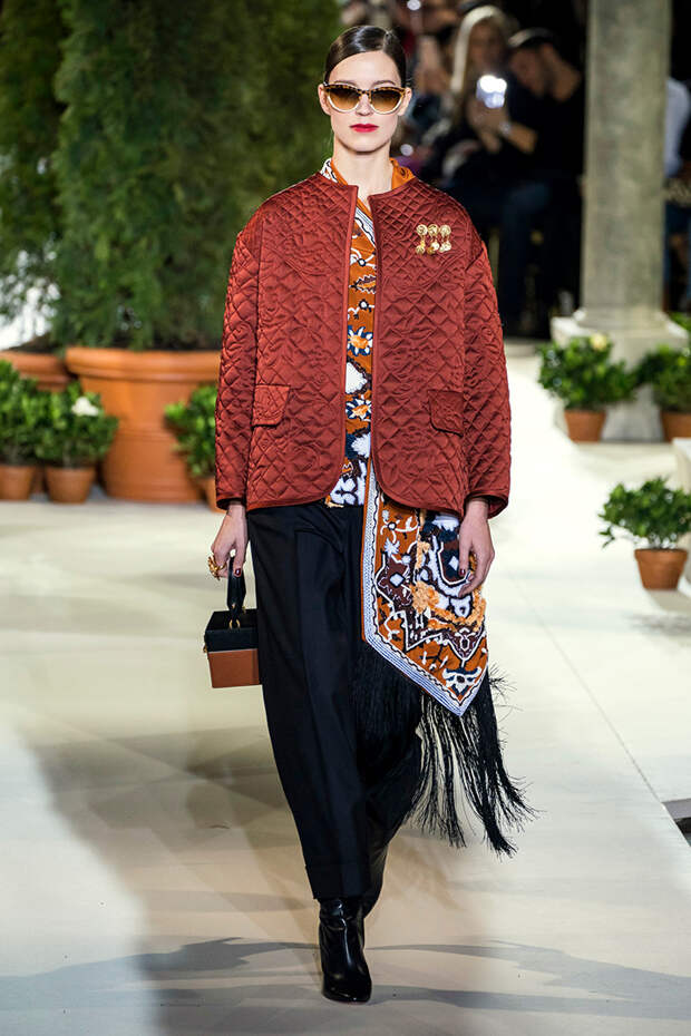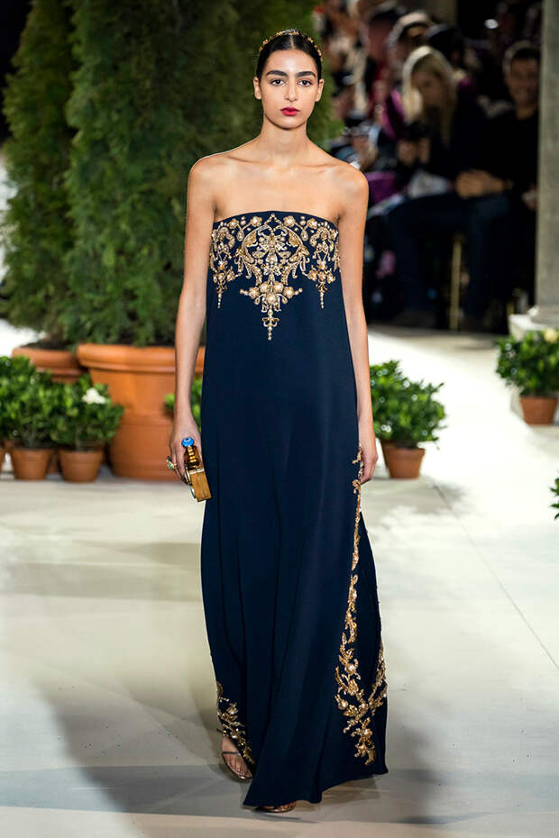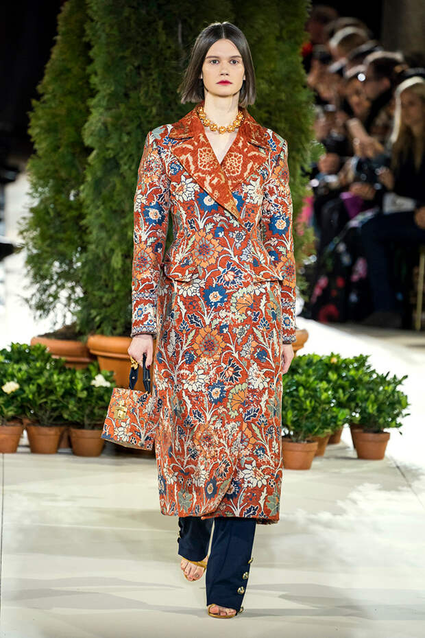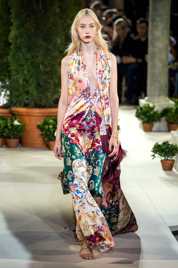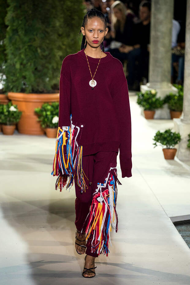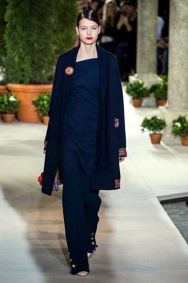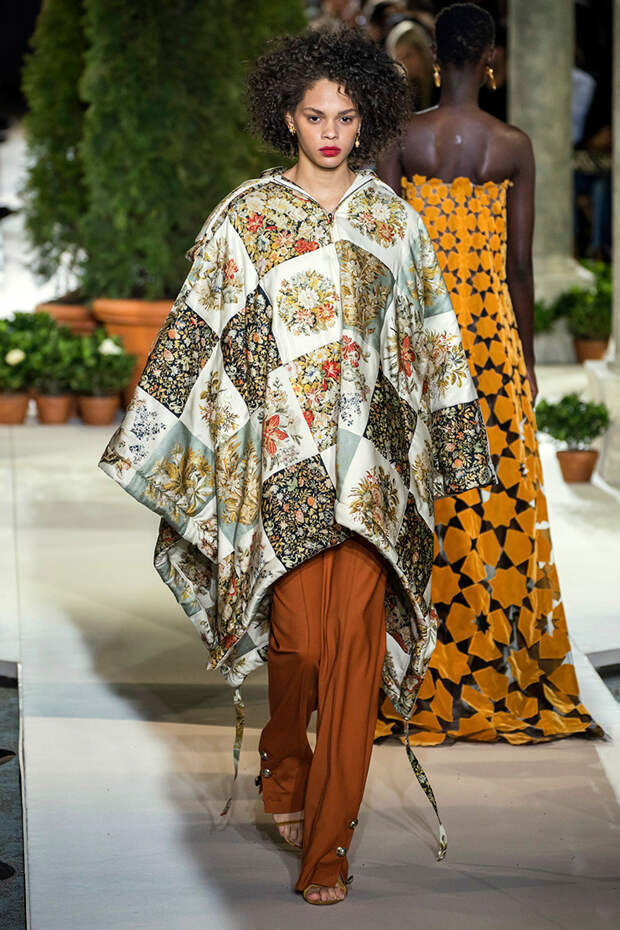 Наследницам этой дамы понравилась бы вторая половина коллекции - этническая, но условно: прямых отсылок к культуре какого-то конкретного народа в ней нет, но много очень общих деталей, по традиции ассоциирующихся с этникой и бохо. Особенно хороши те вещи, в которых команда Oscar de la Renta берется за внедрение в "богатые" гардеробы "бедных" народных промыслов. Из расписных стеганых квадратов собираютс] пончо, из гобеленовых плиток - нежно-голубое пальто. Проходятся дизайнеры и по коврам - если в России к этому предмету декора принято относиться с усмешкой, то Ким с Гарсия подобных предрассудков лишены.