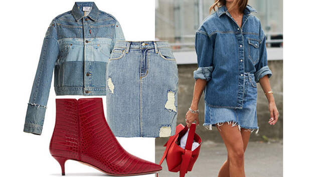 Юбка + джинсовка + яркие ботильоны