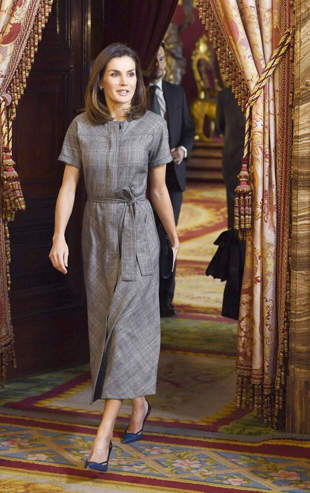 Пока Мелания Трамп даже благотворительные мероприятия посещает в дизайнерской одежде, королева Летиция продолжает испытывать теплые чувства к масс-маркету. Вчера супруга короля Филиппа VI посетила встречу членов фонда Принцессы Жиронской в Королевском дворце в Мадриде и патриотично отдала предпочтение испанским брендам: Летиция встречала собравшихся в сером клетчатом платье Massimo Dutti и синих лодочках из кожи рептилии с черным клатчем — все от Magrit, а единственным украшением нашей героини стали минималистичные серьги Bvlgari.