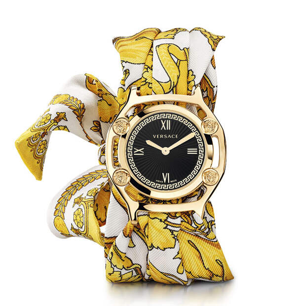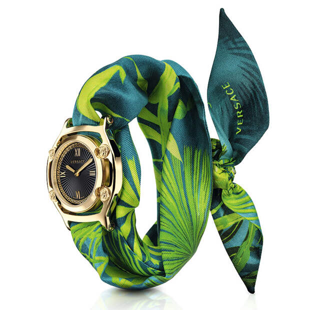 36-миллиметровый корпус обрамлен платком-браслетом, который представлен в двух вариантах: с фирменными тропическими и барочными принтами. При желании оба можно заменить на нейтральный кожаный ремешок.