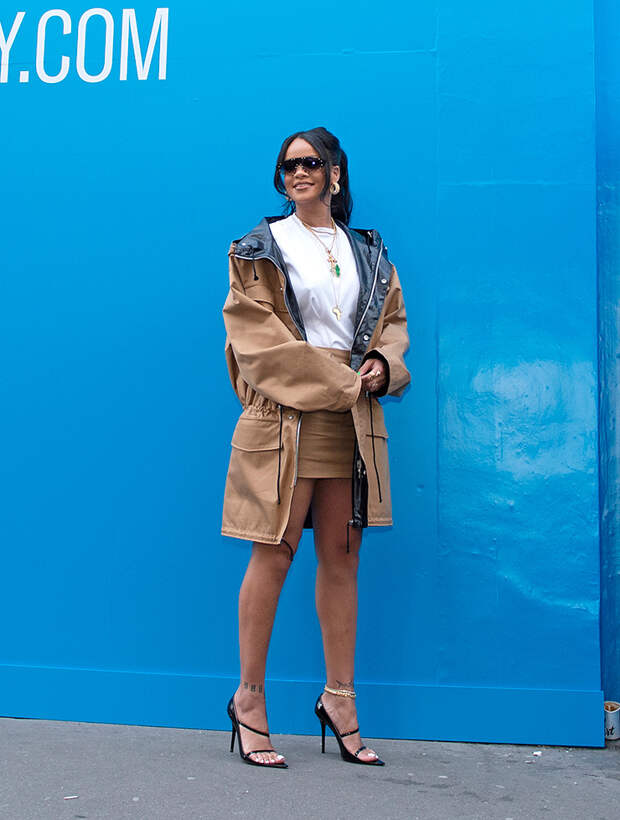 Рианна продолжает знакомить мир со своей дебютной коллекцией Fenty, созданной под патронажем LVMH. Вчера состоялась презентация, а сегодня во французской столице прошло превью творений начинающего дизайнера. Рианна – лучшая реклама собственной продукции, поэтому певица прибыла на мероприятие в новинках собственного производства: мини-юбке и длинной парке в тон, а дополнила комплект простая белая футболка.