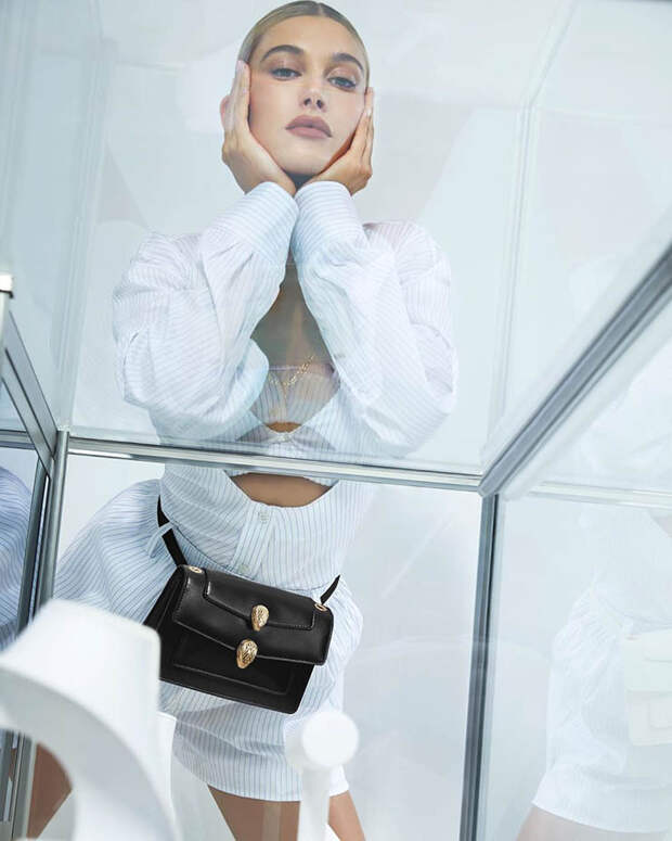 Змейка Serpenti – фирменный мотив бренда, которому посвящена одна из самых популярных его коллекций. Конкретным референсом для Вэнга были золотые часы 60-х, а мятный оттенок одной из моделей вдохновлен ароматом Bvlgari Eau The Vert. В коллекции также есть варианты базового черного и белого цвета. Героиней рекламной кампании стала Хейли Бибер. Девушка является давней подругой бренда: в мае она вышла в смелом платье Alexander Wang на красную дорожку MET Gala.