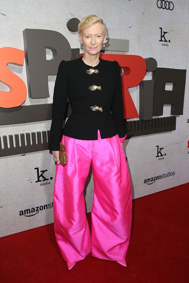 Драма "Суспирия", снятая Лукой Гуаданьино по мотивам одноименного фильма 1977-го года, выйдет в российский прокат в конце ноября, а пока мы можем полюбоваться на исполнительниц главных ролей на голливудской премьере. 57-летняя Тильда Суинтон произвела фурор на красной дорожке, появившись на вечере в комплекте от любимых Schiaparelli: актрисе приглянулись гиперширокие брюки из розового сатина и черный жакет с застежками в форме кистей рук.