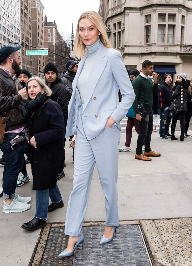 Цветной total look – главный модный тренд нового сезона. Мы уже видели его на Энн Хэтэуэй, Рианне, Виктории Бекхэм и других звездах, теперь же об этом эффектном приеме нам решила напомнить Карли Клосс. Фотографы поймали модель между показами на улицах Нью-Йорка в безупречном брючном костюме небесно-голубого цвета от Ralph Lauren.