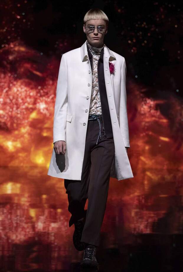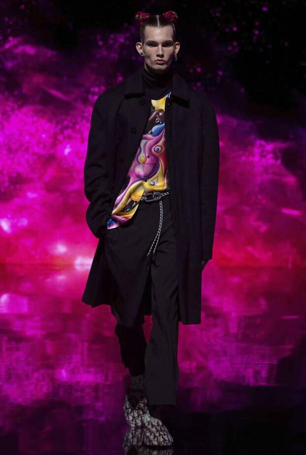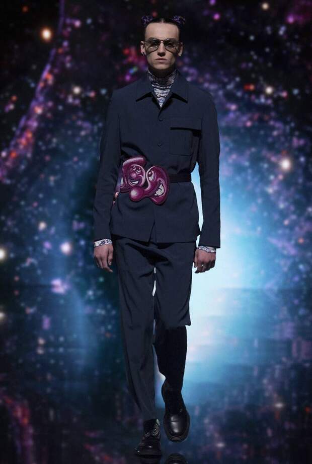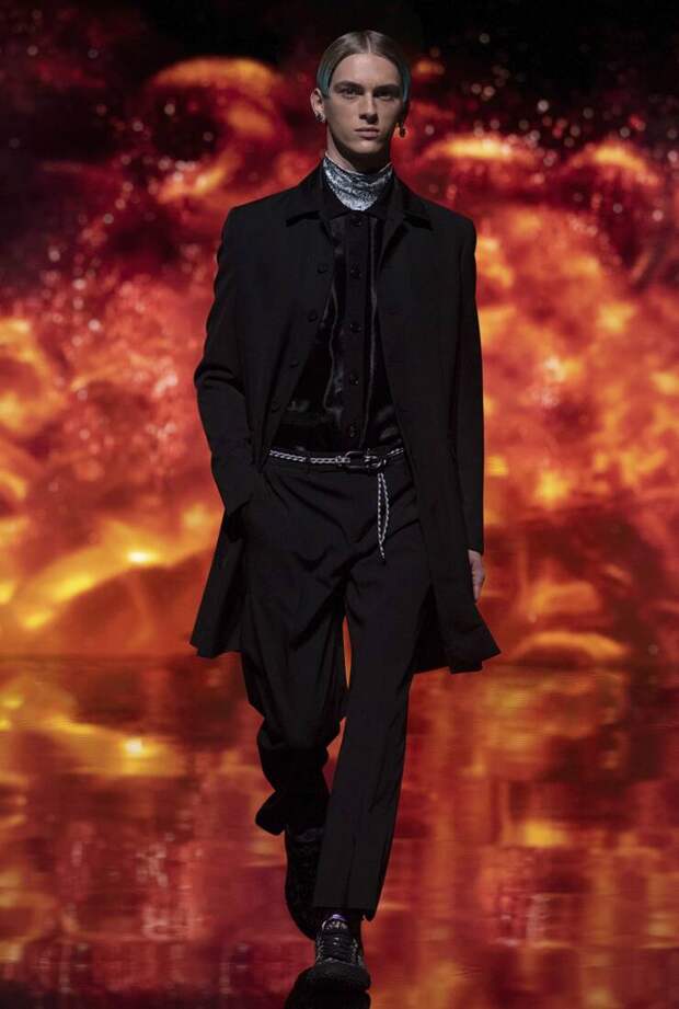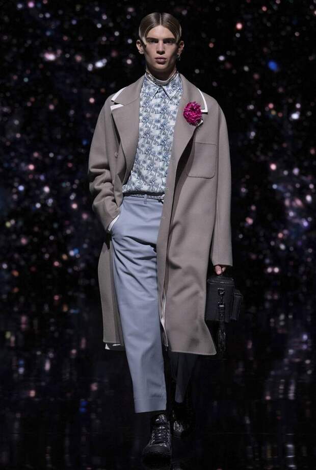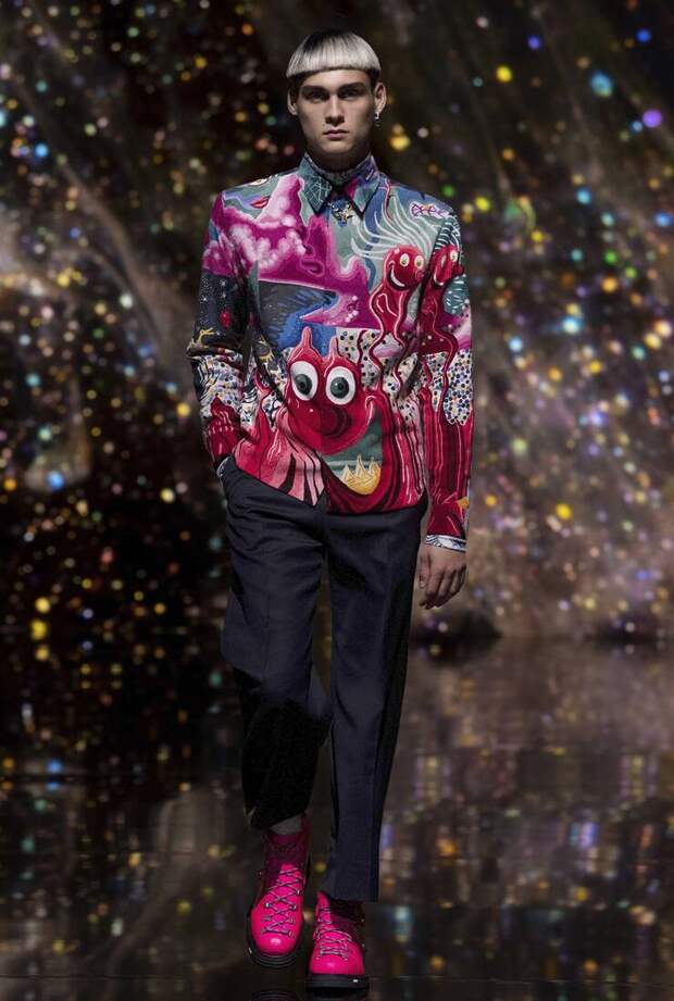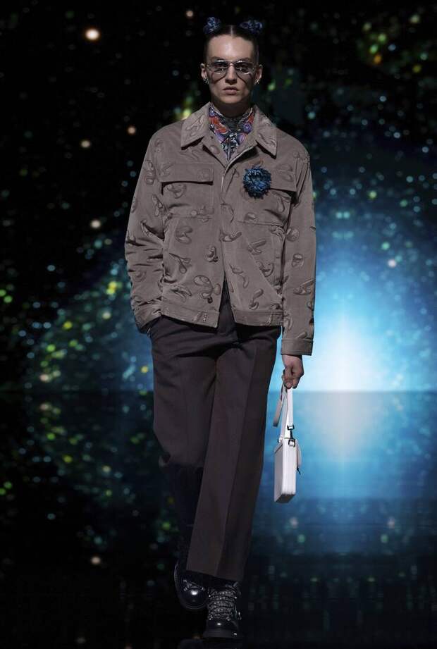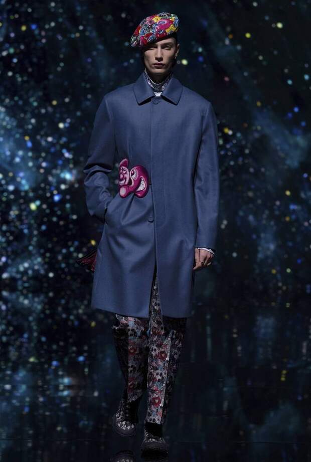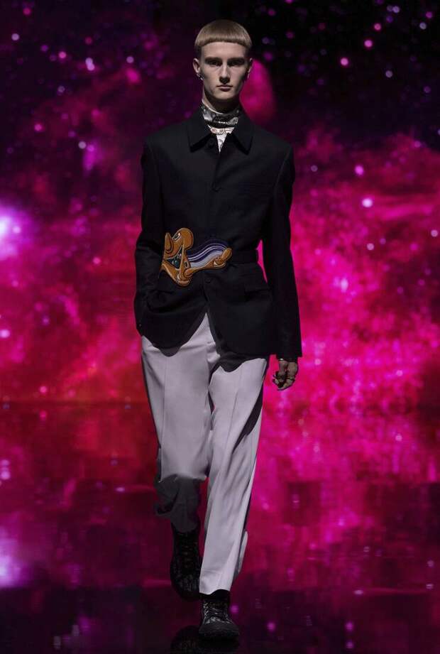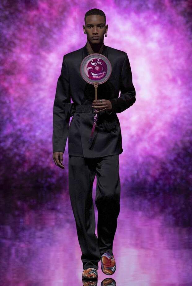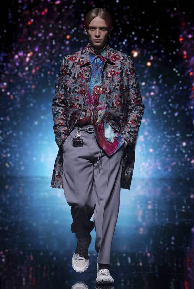 Получился яркий и ироничный микс, в котором кутюрные по уровню дизайна и исполнения пиджаки и пальто смешаны с ярко-розовыми хайкерами, меховыми слиперами с монограммой Dior и психоделическими брюками и рубашками. Еще один очевидный лейтмотив коллекции — Азия. Принты, явно вдохновленные аниме, кислотно-яркие оттенки и прически, отсылающие к японской субкультуре харадзюку или корейским бойзбендам, пояса-оби поверх пиджаков и даже забавный психоделичный веер с кисточкой в закрывающем показ образе — все говорит о том, что взгляды Джонса и Dior устремлены на Восток. И это наверняка не только эстетический, но и стратегический момент: Азия первой оправилась от последствий коронакризиса и снова готова покупать люкс в промышленных масштабах. Так что для закрепления эффекта на ближайших красных ковровых дорожках (пусть даже всего лишь виртуальных) в этих вещах мы вполне можем увидеть не только лицо Дома Роберта Паттинсона, но и, скажем, группу BTS. И Беллу Хадид, на которой брючный костюм Dior (пусть и Men) будет смотреться ничуть не менее органично.