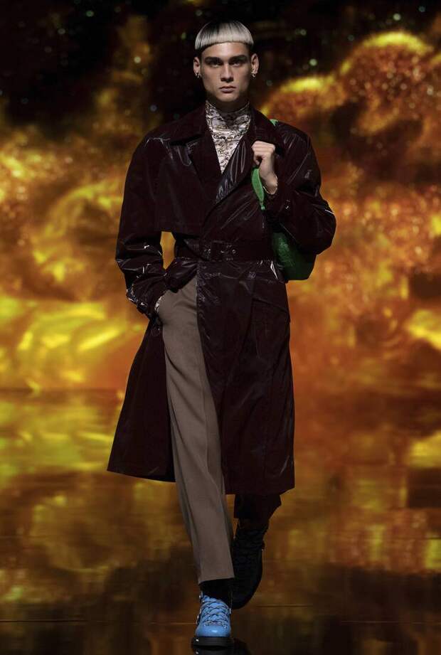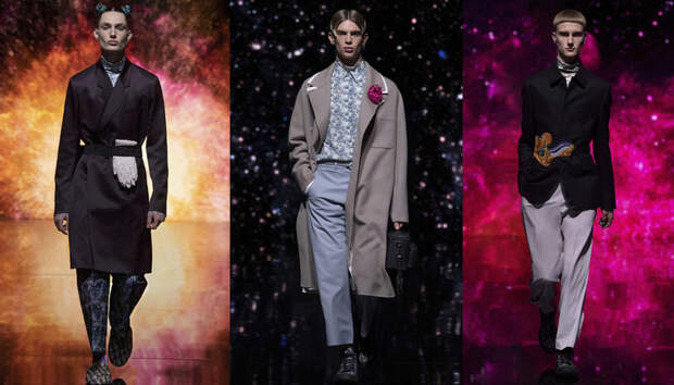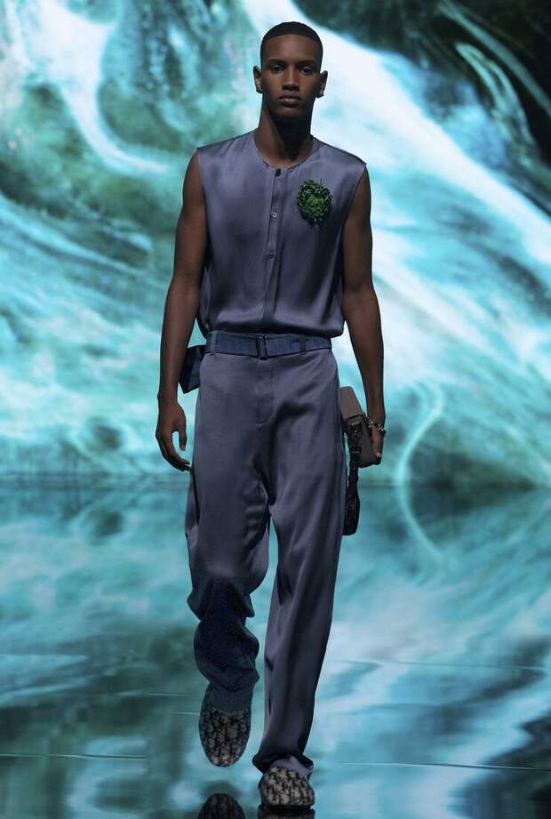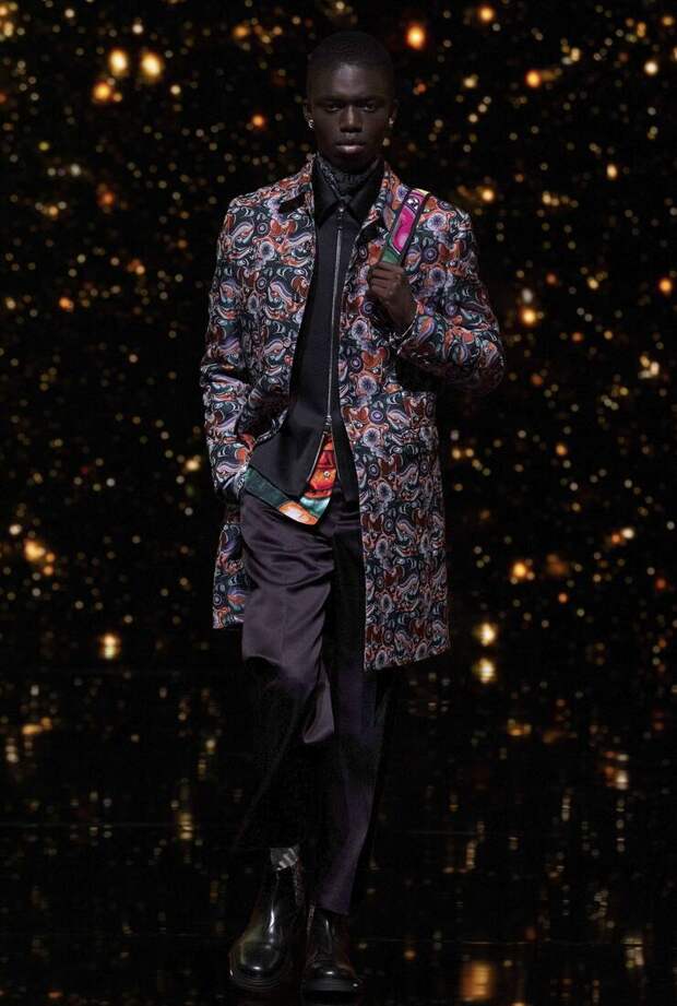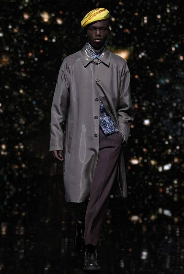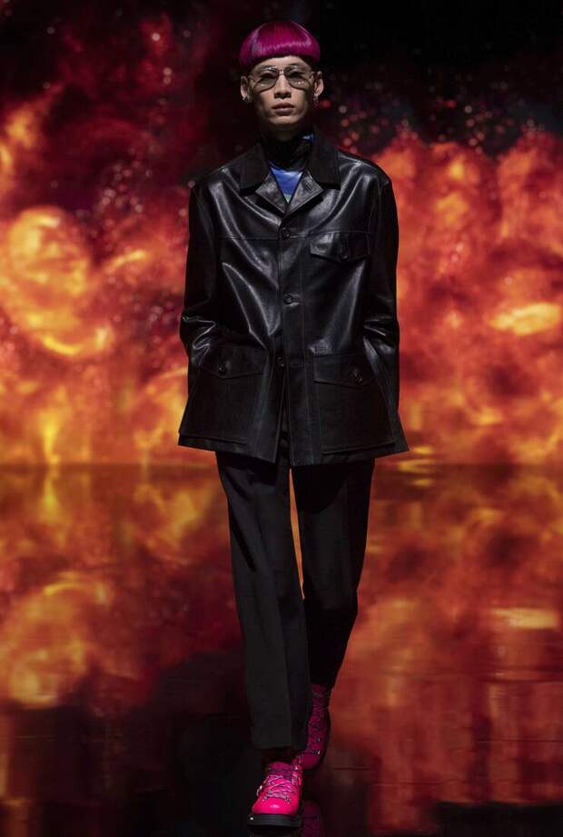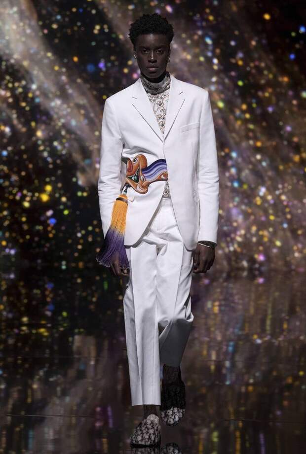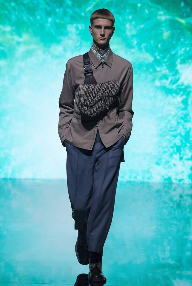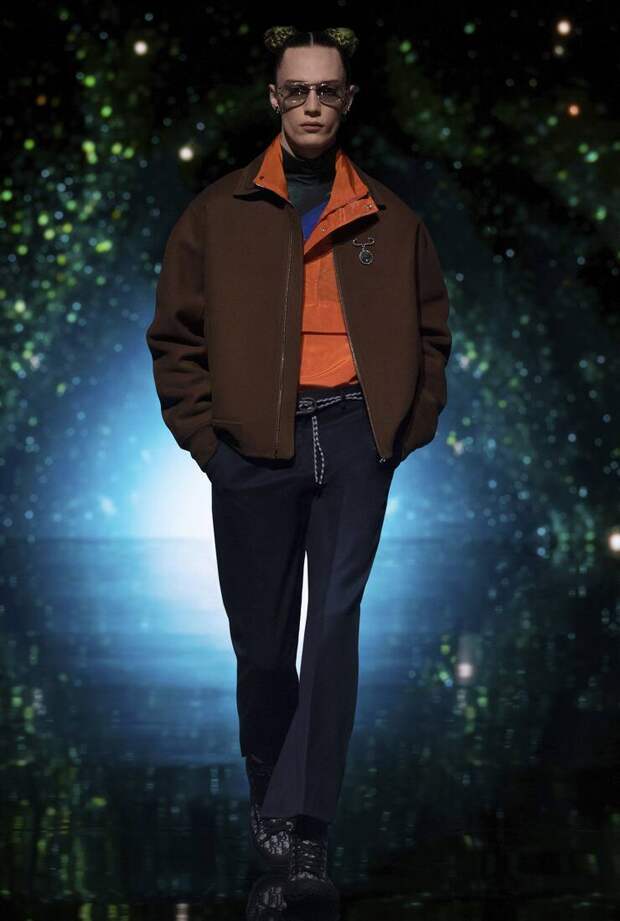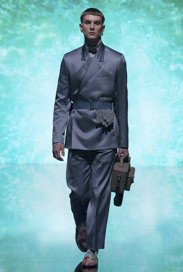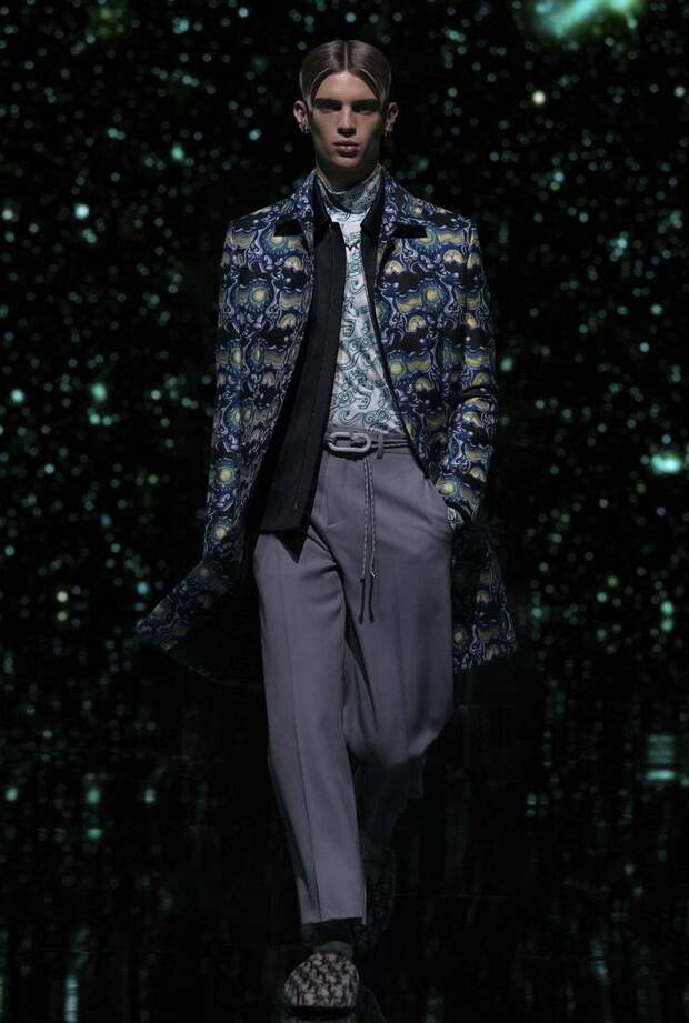 Получился яркий и ироничный микс, в котором кутюрные по уровню дизайна и исполнения пиджаки и пальто смешаны с ярко-розовыми хайкерами, меховыми слиперами с монограммой Dior и психоделическими брюками и рубашками. Еще один очевидный лейтмотив коллекции — Азия. Принты, явно вдохновленные аниме, кислотно-яркие оттенки и прически, отсылающие к японской субкультуре харадзюку или корейским бойзбендам, пояса-оби поверх пиджаков и даже забавный психоделичный веер с кисточкой в закрывающем показ образе — все говорит о том, что взгляды Джонса и Dior устремлены на Восток. И это наверняка не только эстетический, но и стратегический момент: Азия первой оправилась от последствий коронакризиса и снова готова покупать люкс в промышленных масштабах. Так что для закрепления эффекта на ближайших красных ковровых дорожках (пусть даже всего лишь виртуальных) в этих вещах мы вполне можем увидеть не только лицо Дома Роберта Паттинсона, но и, скажем, группу BTS. И Беллу Хадид, на которой брючный костюм Dior (пусть и Men) будет смотреться ничуть не менее органично.