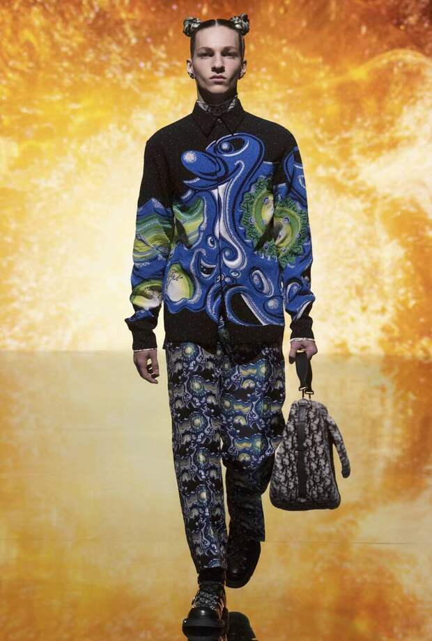 В новой коллекции Ким Джонс не стал отступать от этих начал — и обильно “сдобрил” их еще и яркими цветами и сюрреалистичными принтами (чем-то средним между картинами Сальвадора Дали и Такаси Мураками).