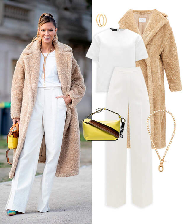 Футболка ROCHAS, 29 229 руб.; брюки ROLAND MOURET, 51 082 руб.; шуба MAX MARA, 182 818 руб.; сумка GANNI, 32 557 руб.; колье ACO RABANNE, 33 463 руб.; сережки THEODORA WARRE, 24 380 руб.