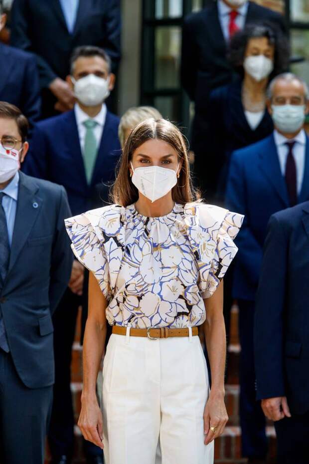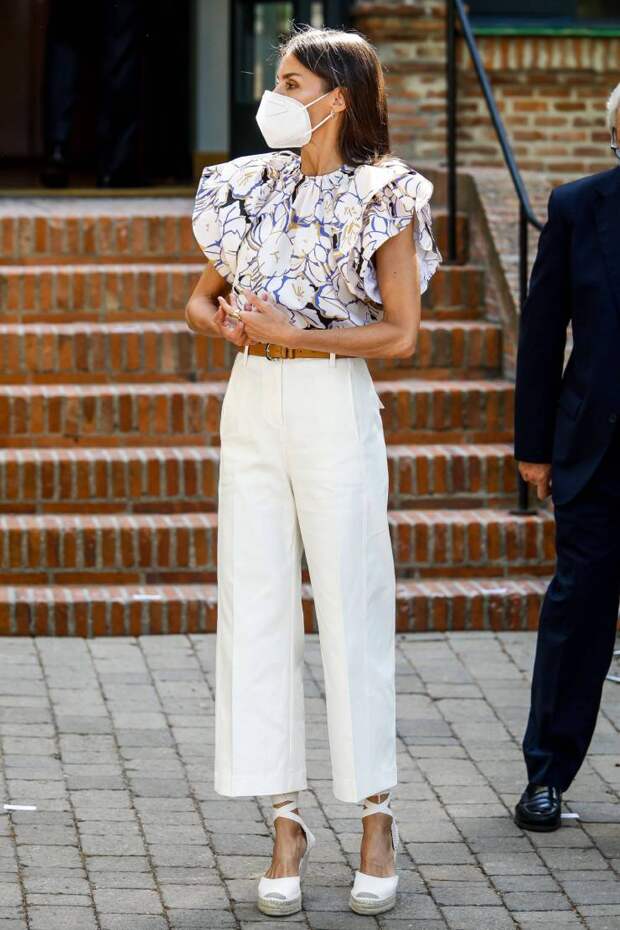 На днях королева Испании посетила мероприятие в одном из старейших мадридских студенческих общежитий. Для этого она выбрала легкую блузу в крупный цветочный принт с воздушными плечами и укороченные белые брюки в лаконичном стиле. Непринужденный летний образ дополнили эспадрильи на массивной платформе с завязками, тонкий коричневый пояс, а также защитная маска, которая уже стала незаменимым аксессуаром. Также на Летиции можно заметить золотое кольцо и небольшие круглые серьги.