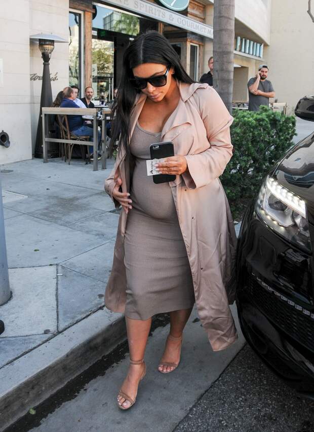 Оверсайз-жакеты на обнаженное тело, бесконечные “голые” платья, огромное количество нюдовых кроп-топов и облегающих юбок – все это для нее “база”. Подобные вещи миссис Уэст носила и во время беременности, ведь они являются истинным ДНК ее стиля.