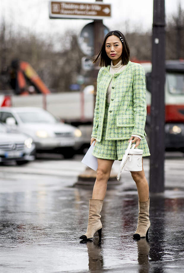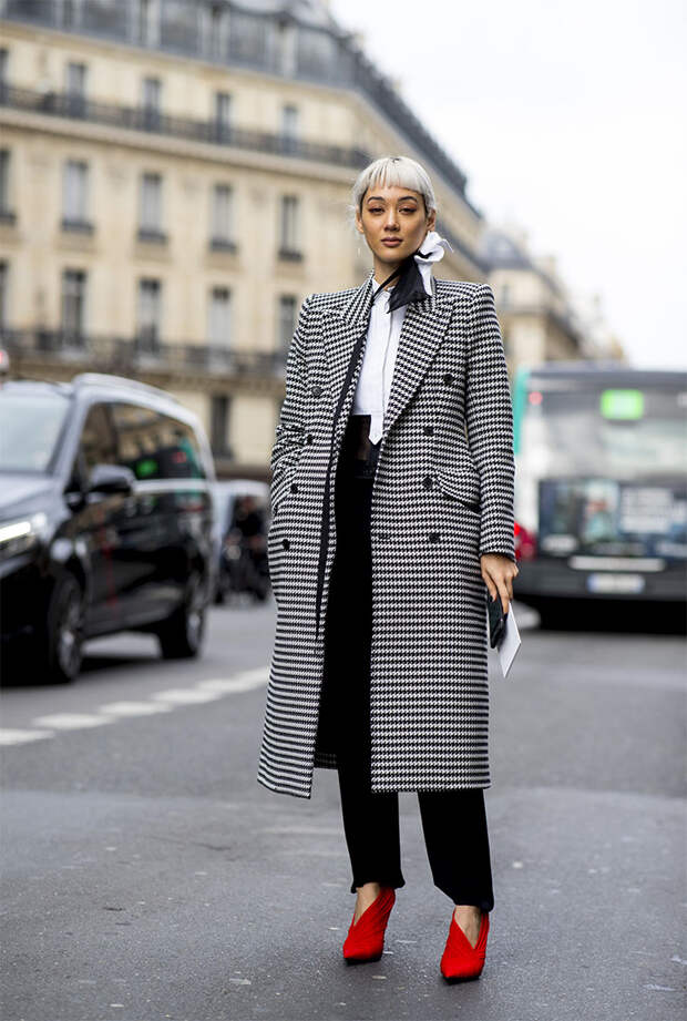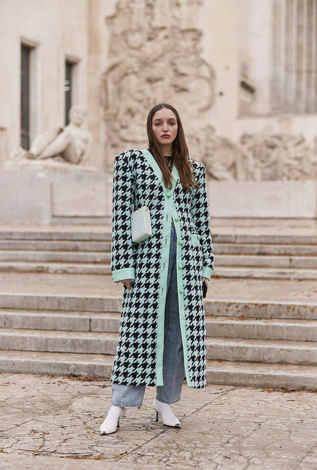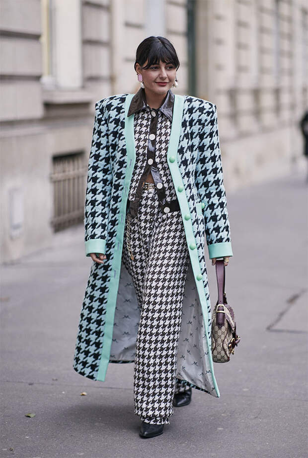 Спустя пару десятилетий и сам Кристиан Диор был не против приправить так называемой «ломанной клеткой» свои изящные наряды. Согласитесь, список «инфлюенсеров» очень даже внушительный. Сегодня традиционная «гусиная лапка» меняется из сезона в сезон. Помимо классического черно-белого варианта мы не раз видели на подиумах цветные варианты. В этом сезоне «гусиная лапка» укрупнилась и стала отдаленно напоминать шахматную доску – этот тренд демонстрируют на себе и гостьи Недель моды.